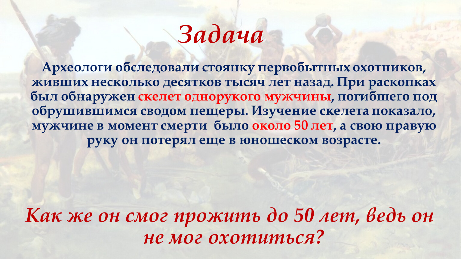 Археологи обследовали стоянку первобытных охотников, живших несколько десятков тысяч лет назад. При раскопках был обнаружен скелет однорукого мужчины, погибшего под обрушившимся сводом пещеры. Изучение скелета показало, мужчине в момент смерти было около 50 лет, а свою правую руку он потерял еще в юношеском возрасте.