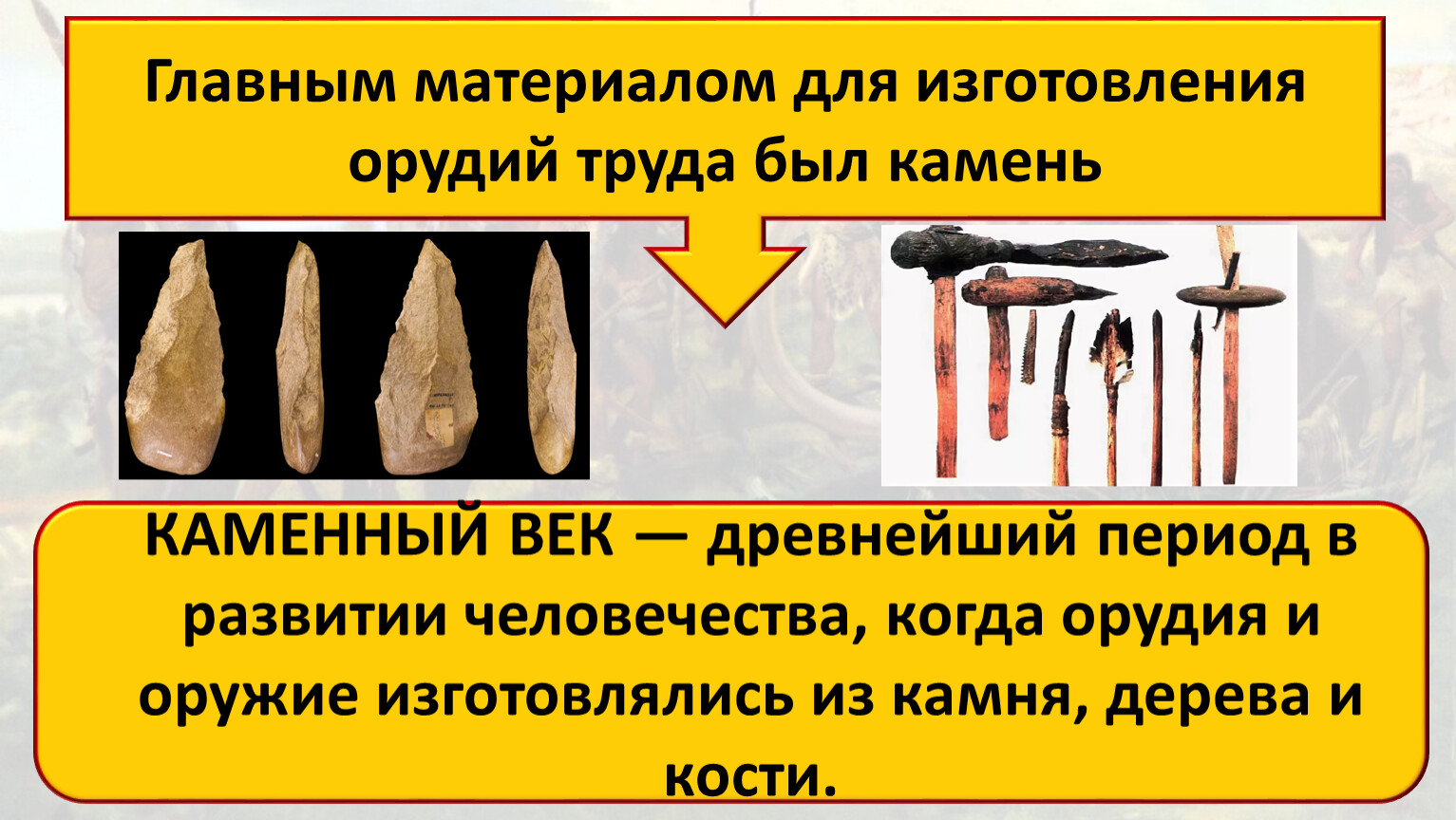 КАМЕННЫЙ ВЕК — древнейший период в развитии человечества, когда орудия и оружие изготовлялись из камня, дерева и кости.
