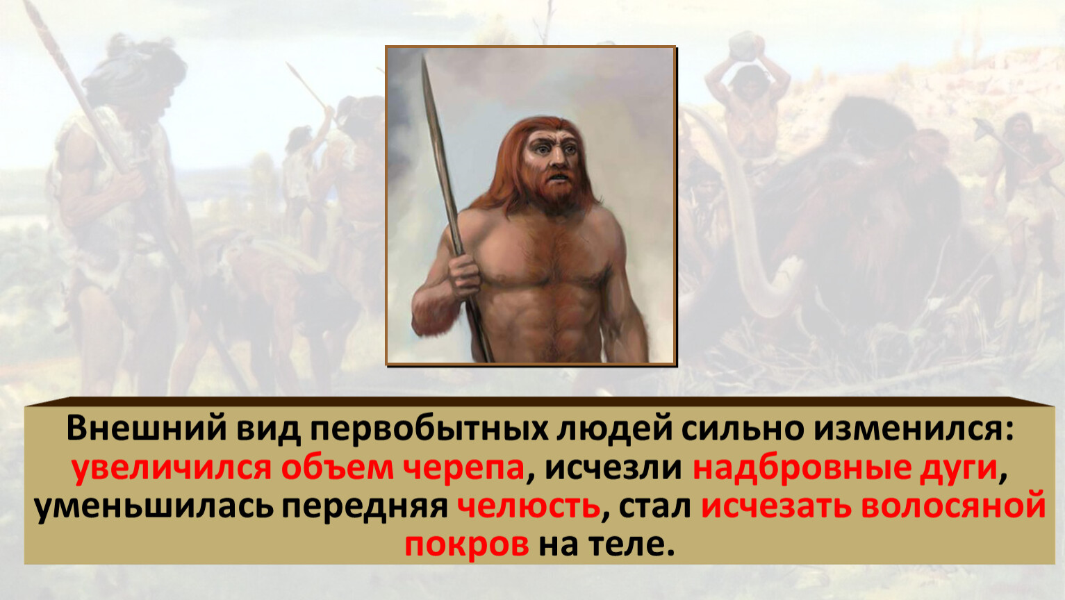 Внешний вид первобытных людей сильно изменился: увеличился объем черепа, исчезли надбровные дуги, уменьшилась передняя челюсть, стал исчезать волосяной покров на теле.