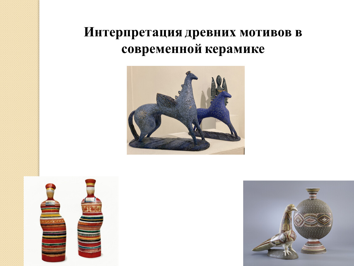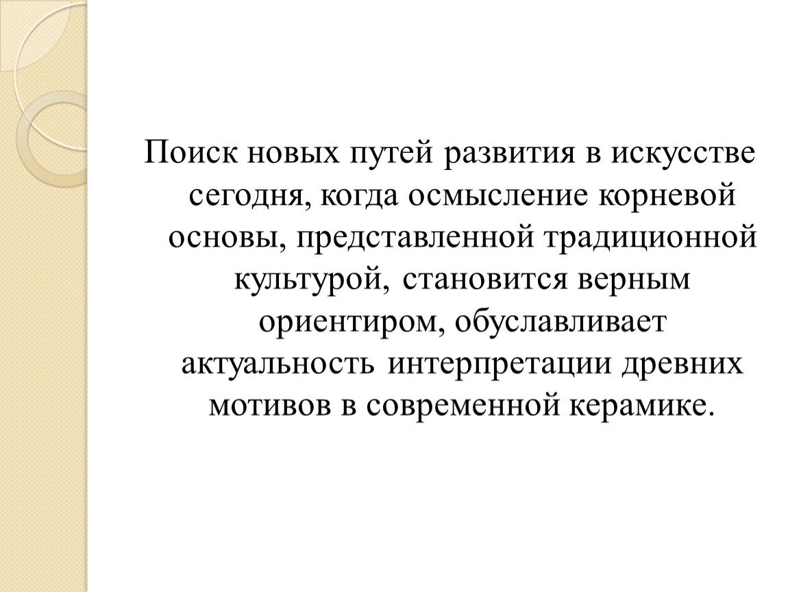 Поиск новых путей развития в искусстве сегодня, когда осмысление корневой основы, представленной традиционной культурой, становится верным ориентиром, обуславливает актуальность интерпретации древних мотивов в современной керамике.