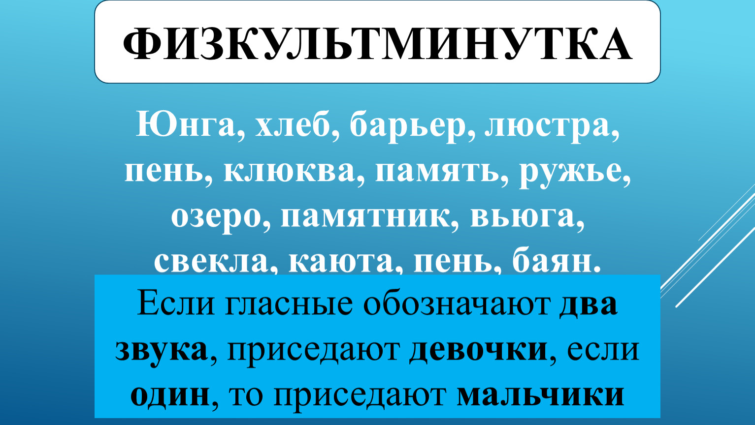 Если гласные обозначают два звука, приседают девочки, если один, то приседают мальчики