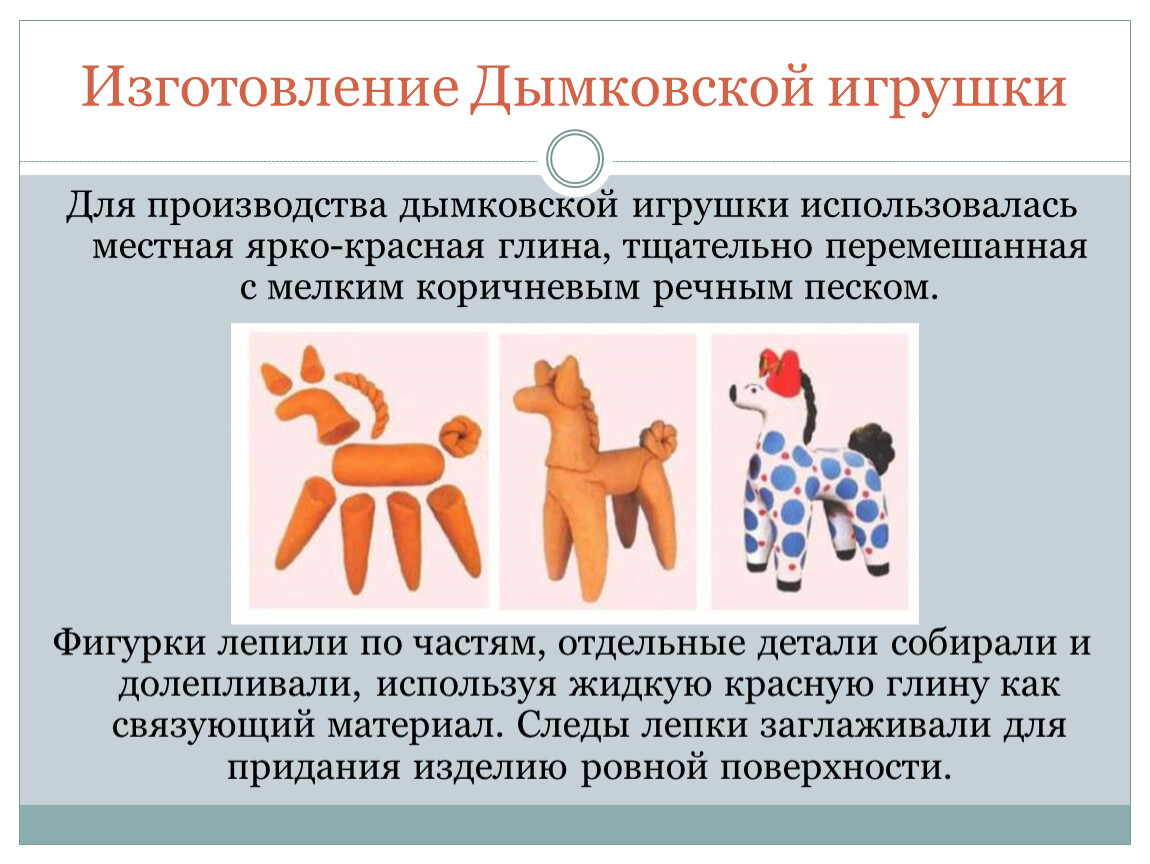 Для производства дымковской игрушки использовалась местная ярко-красная глина, тщательно перемешанная с мелким коричневым речным песком.