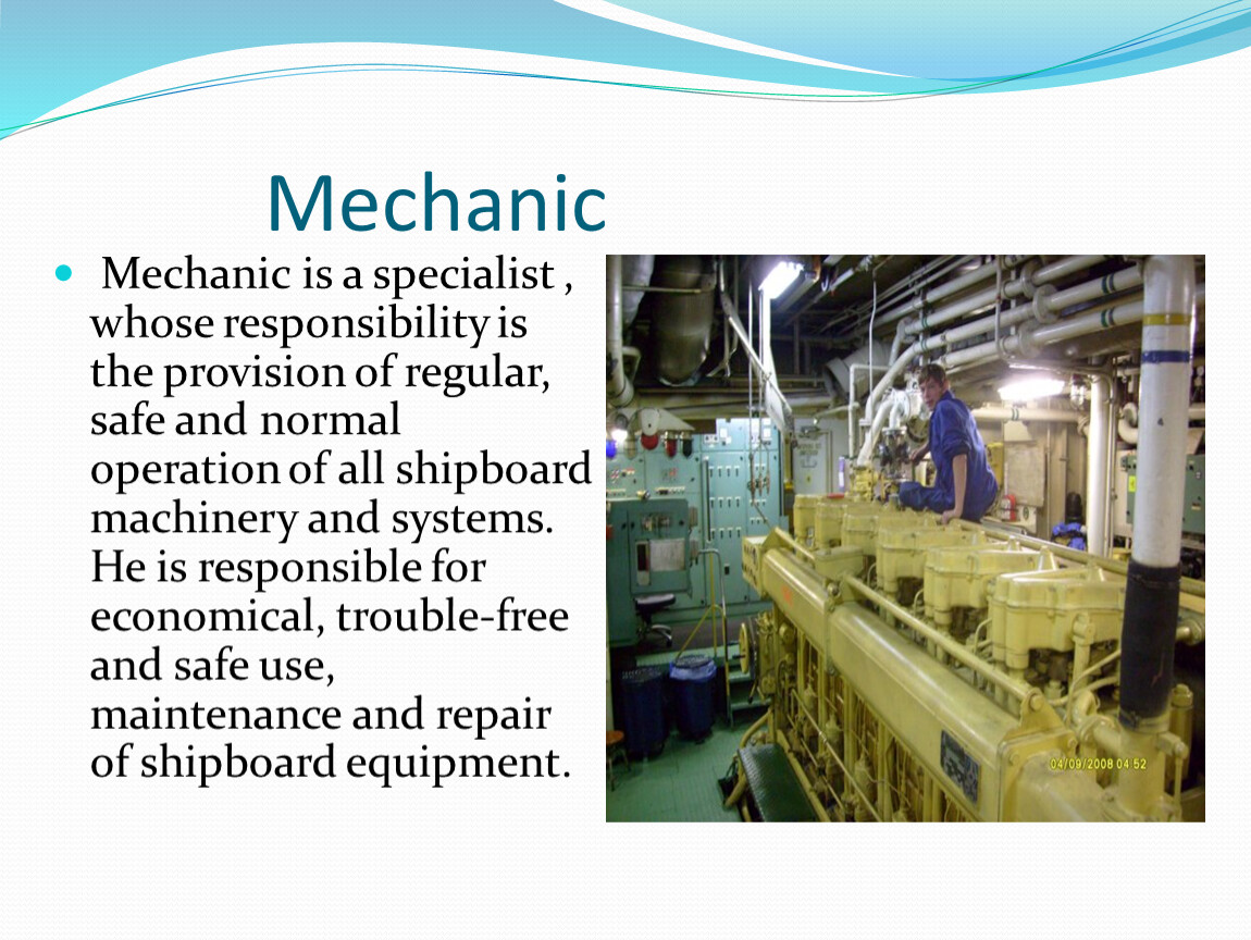 Mechanic is a specialist , whose responsibility is the provision of regular, safe and normal operation of all shipboard machinery and systems. He is responsible for economical, trouble-free and safe use, maintenance and repair of shipboard equipment.