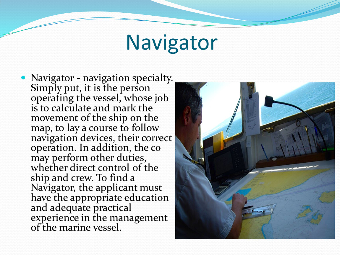 Navigator - navigation specialty. Simply put, it is the person operating the vessel, whose job is to calculate and mark the movement of the ship on the map, to lay a course to follow navigation devices, their correct operation. In addition, the co may perform other duties, whether direct control of the ship and crew. To find a Navigator, the applicant must have the appropriate education and adequate practical experience in the management of the marine vessel.