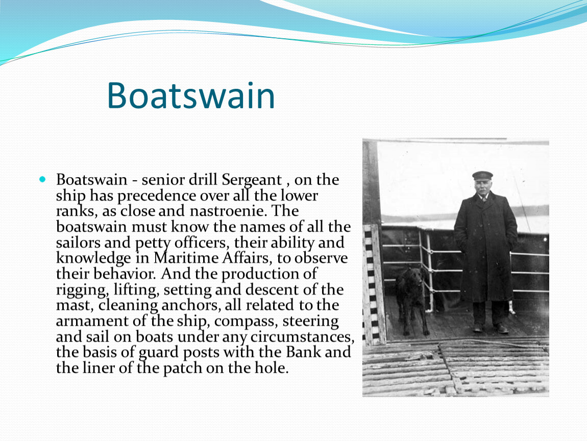 Boatswain - senior drill Sergeant , on the ship has precedence over all the lower ranks, as close and nastroenie. The boatswain must know the names of all the sailors and petty officers, their ability and knowledge in Maritime Affairs, to observe their behavior. And the production of rigging, lifting, setting and descent of the mast, cleaning anchors, all related to the armament of the ship, compass, steering and sail on boats under any circumstances, the basis of guard posts with the Bank and the liner of the patch on the hole.