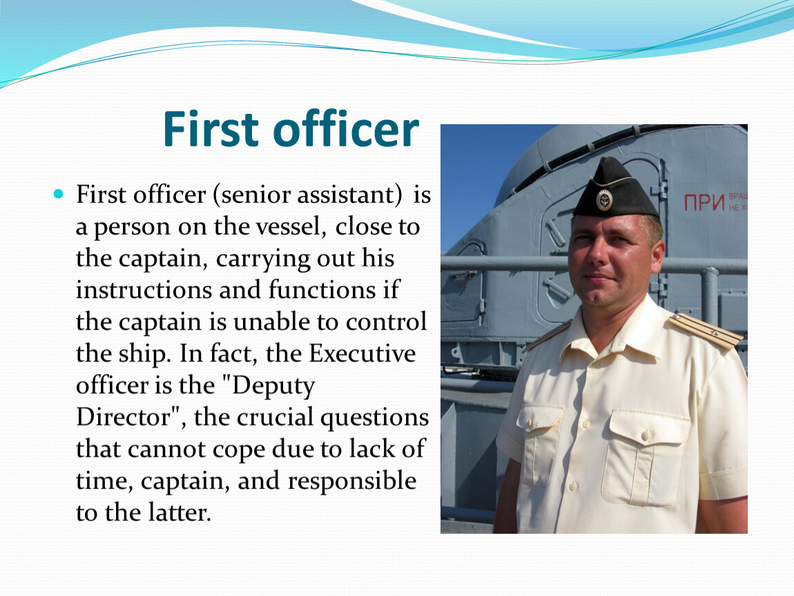 First officer (senior assistant) is a person on the vessel, close to the captain, carrying out his instructions and functions if the captain is unable to control the ship. In fact, the Executive officer is the "Deputy Director", the crucial questions that cannot cope due to lack of time, captain, and responsible to the latter.