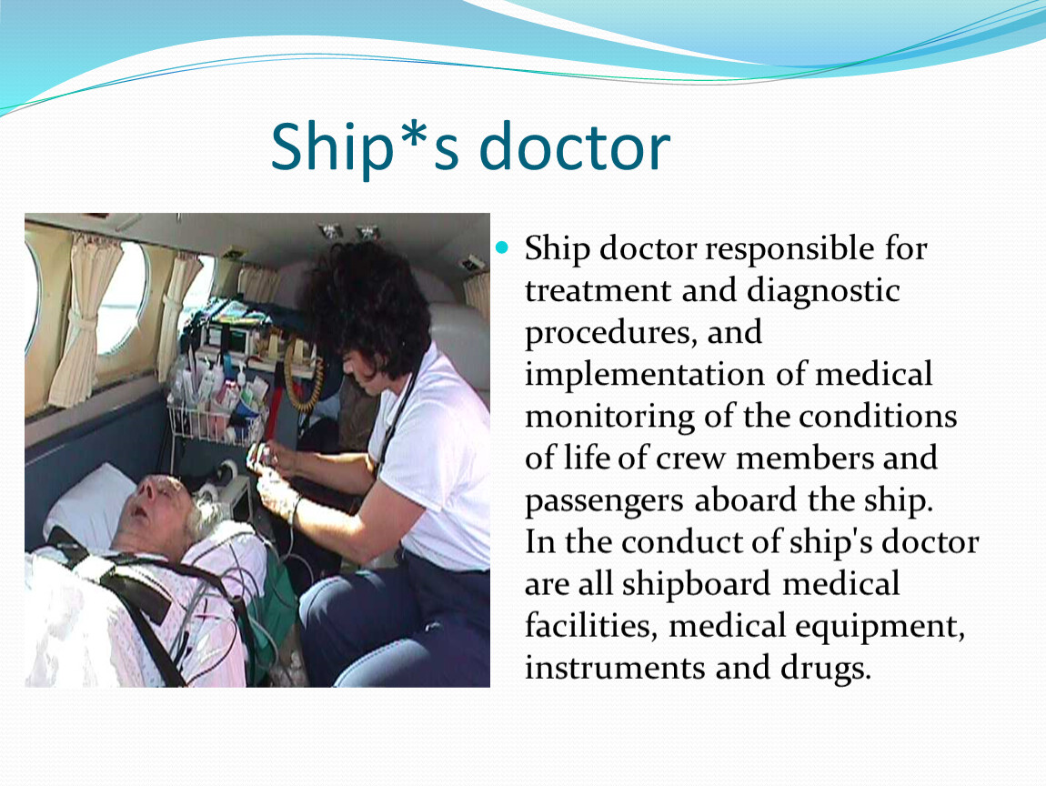 Ship doctor responsible for treatment and diagnostic procedures, and implementation of medical monitoring of the conditions of life of crew members and passengers aboard the ship.In the conduct of ship's doctor are all shipboard medical facilities, medical equipment, instruments and drugs.