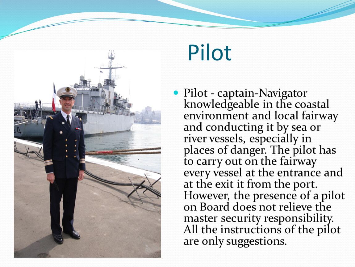 Pilot - captain-Navigator knowledgeable in the coastal environment and local fairway and conducting it by sea or river vessels, especially in places of danger. The pilot has to carry out on the fairway every vessel at the entrance and at the exit it from the port. However, the presence of a pilot on Board does not relieve the master security responsibility. All the instructions of the pilot are only suggestions.