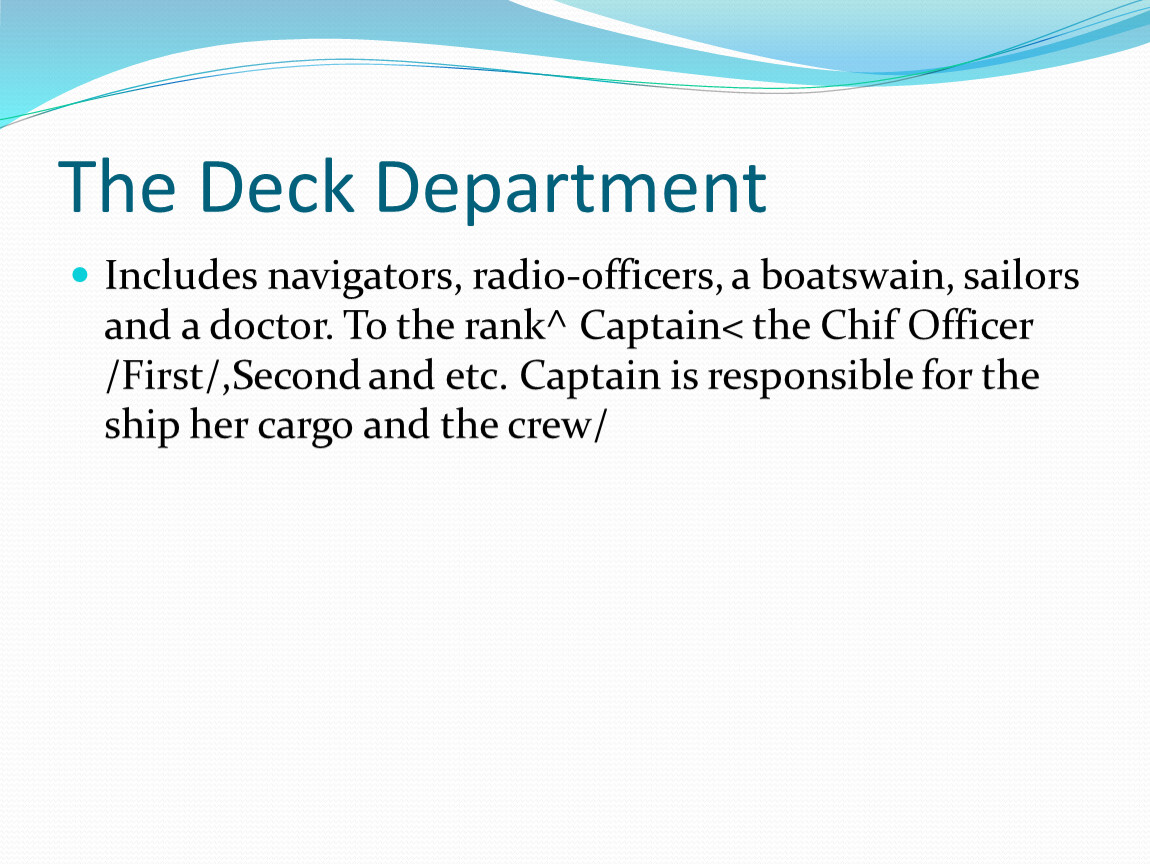 Includes navigators, radio-officers, a boatswain, sailors and a doctor. To the rank^ Captain< the Chif Officer /First/,Second and etc. Captain is responsible for the ship her cargo and the crew/