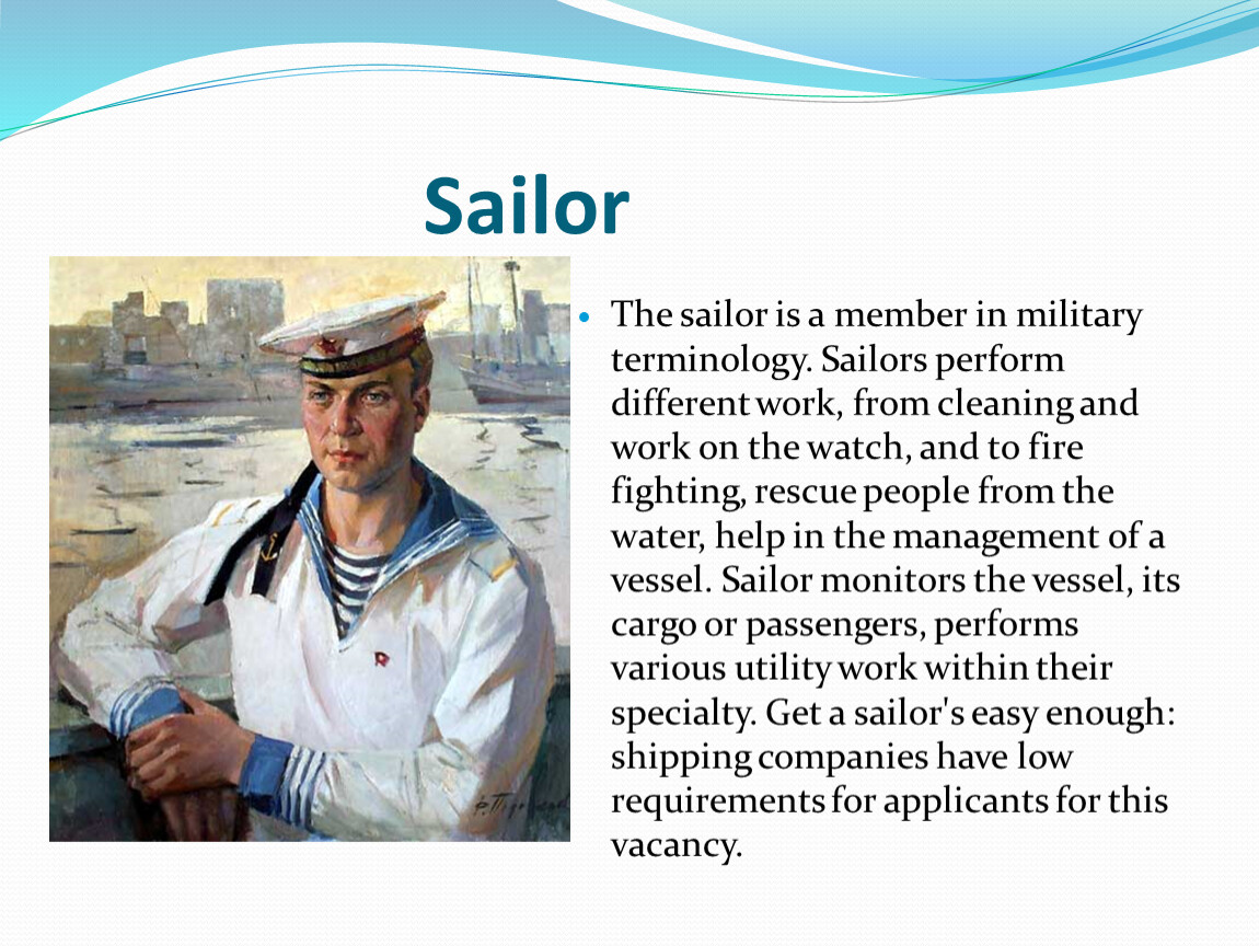 The sailor is a member in military terminology. Sailors perform different work, from cleaning and work on the watch, and to fire fighting, rescue people from the water, help in the management of a vessel. Sailor monitors the vessel, its cargo or passengers, performs various utility work within their specialty. Get a sailor's easy enough: shipping companies have low requirements for applicants for this vacancy.