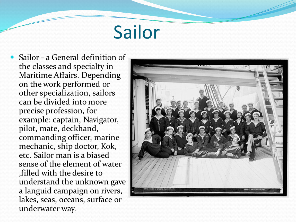 Sailor - a General definition of the classes and specialty in Maritime Affairs. Depending on the work performed or other specialization, sailors can be divided into more precise profession, for example: captain, Navigator, pilot, mate, deckhand, commanding officer, marine mechanic, ship doctor, Kok, etc. Sailor man is a biased sense of the element of water ,filled with the desire to understand the unknown gave a languid campaign on rivers, lakes, seas, oceans, surface or underwater way.