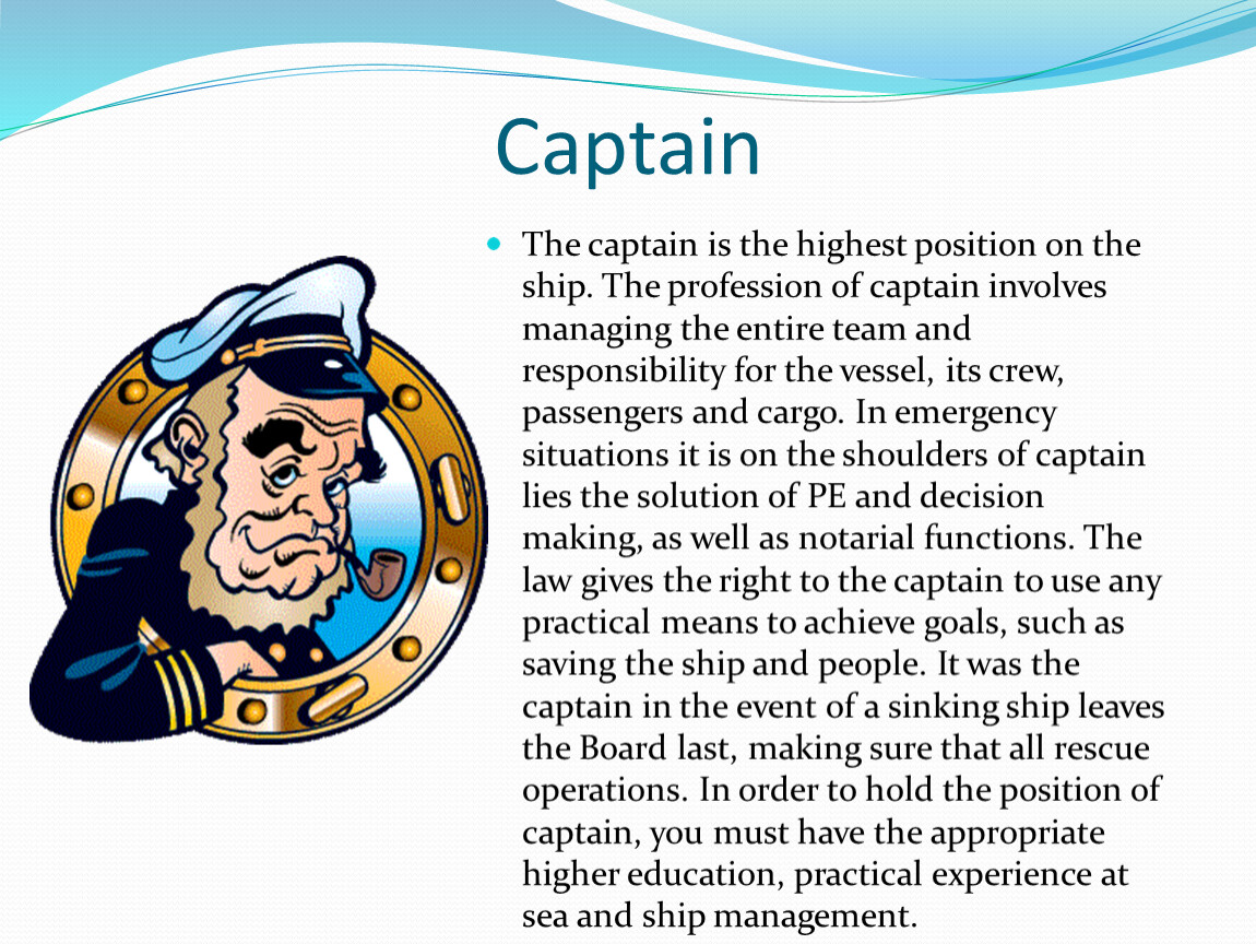 The captain is the highest position on the ship. The profession of captain involves managing the entire team and responsibility for the vessel, its crew, passengers and cargo. In emergency situations it is on the shoulders of captain lies the solution of PE and decision making, as well as notarial functions. The law gives the right to the captain to use any practical means to achieve goals, such as saving the ship and people. It was the captain in the event of a sinking ship leaves the Board last, making sure that all rescue operations. In order to hold the position of captain, you must have the appropriate higher education, practical experience at sea and ship management.