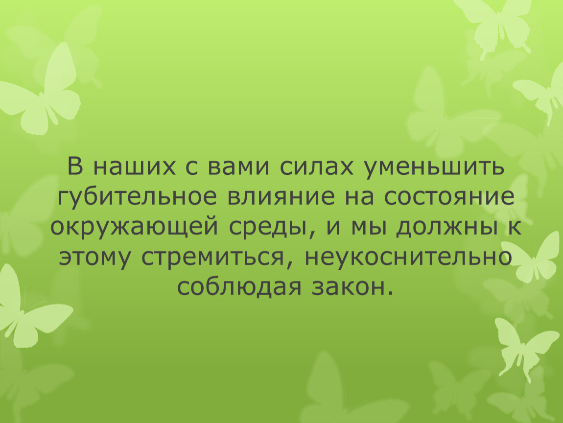 В наших с вами силах уменьшить губительное влияние на состояние окружающей среды, и мы должны к этому стремиться, неукоснительно соблюдая закон.