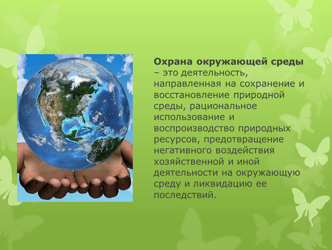 Охрана окружающей среды – это деятельность, направленная на сохранение и восстановление природной среды, рациональное использование и воспроизводство природных ресурсов, предотвращение негативного воздействия хозяйственной и иной деятельности на окружающую среду и ликвидацию ее последствий.