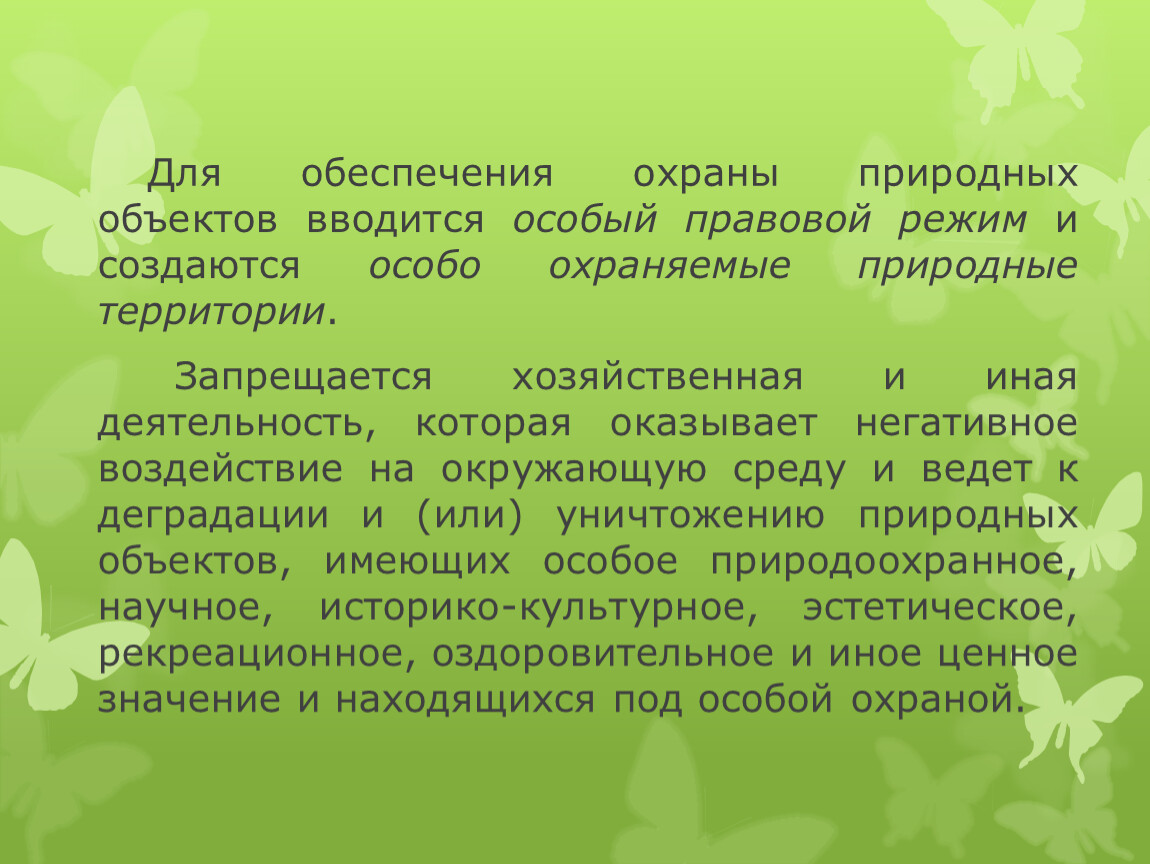 Для обеспечения охраны природных объектов вводится особый правовой режим и создаются особо охраняемые природные территории.