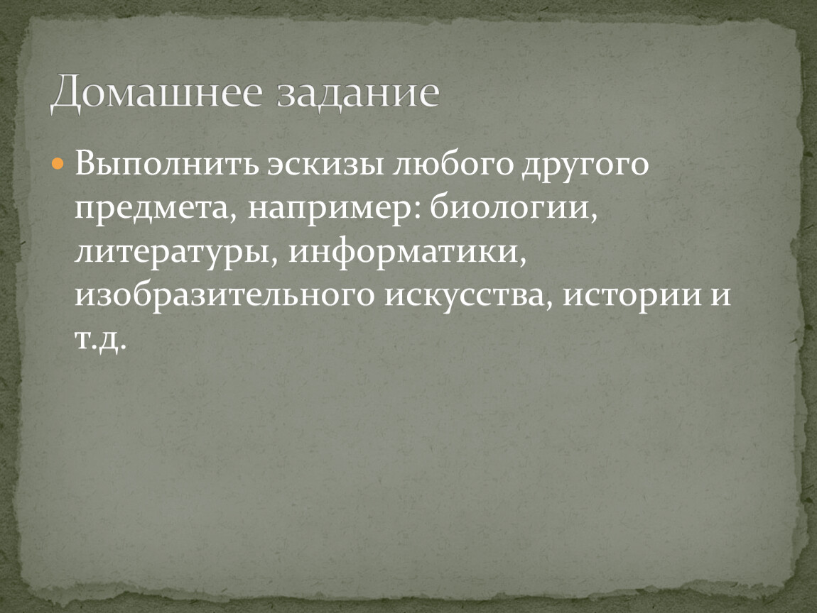 Выполнить эскизы любого другого предмета, например: биологии, литературы, информатики, изобразительного искусства, истории и т.д.