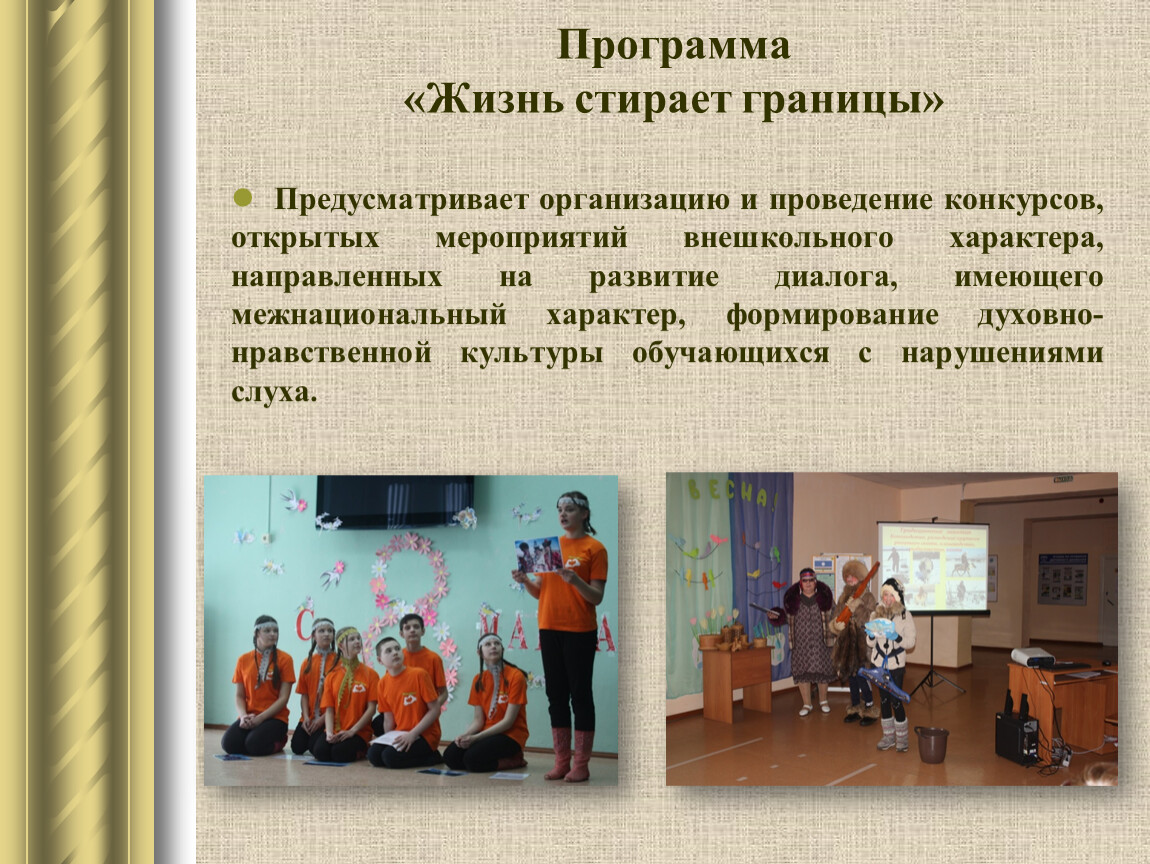 Предусматривает организацию и проведение конкурсов, открытых мероприятий внешкольного характера, направленных на развитие диалога, имеющего межнациональный характер, формирование духовно-нравственной культуры обучающихся с нарушениями слуха.