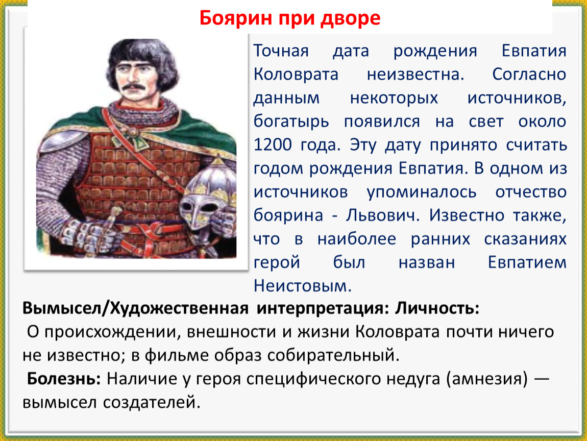 Фильм «Легенда о Коловрате» (2017) — это скорее героическая «киносказка» или былина, а не строгая историческая хроника. В основе лежит «Повесть о разорении Рязани Батыем» (XIII-XVI вв.), но образ Коловрата — это легенда, а не подтвержденная документами личность. Фильм художественно интерпретирует события, фокусируясь на патриотизме.