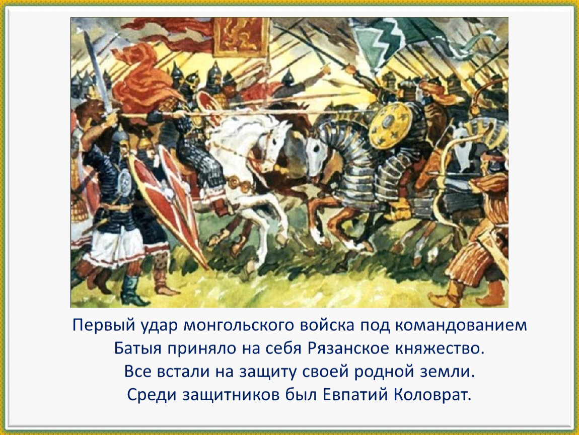 Первый удар монгольского войска под командованием Батыя приняло на себя Рязанское княжество.