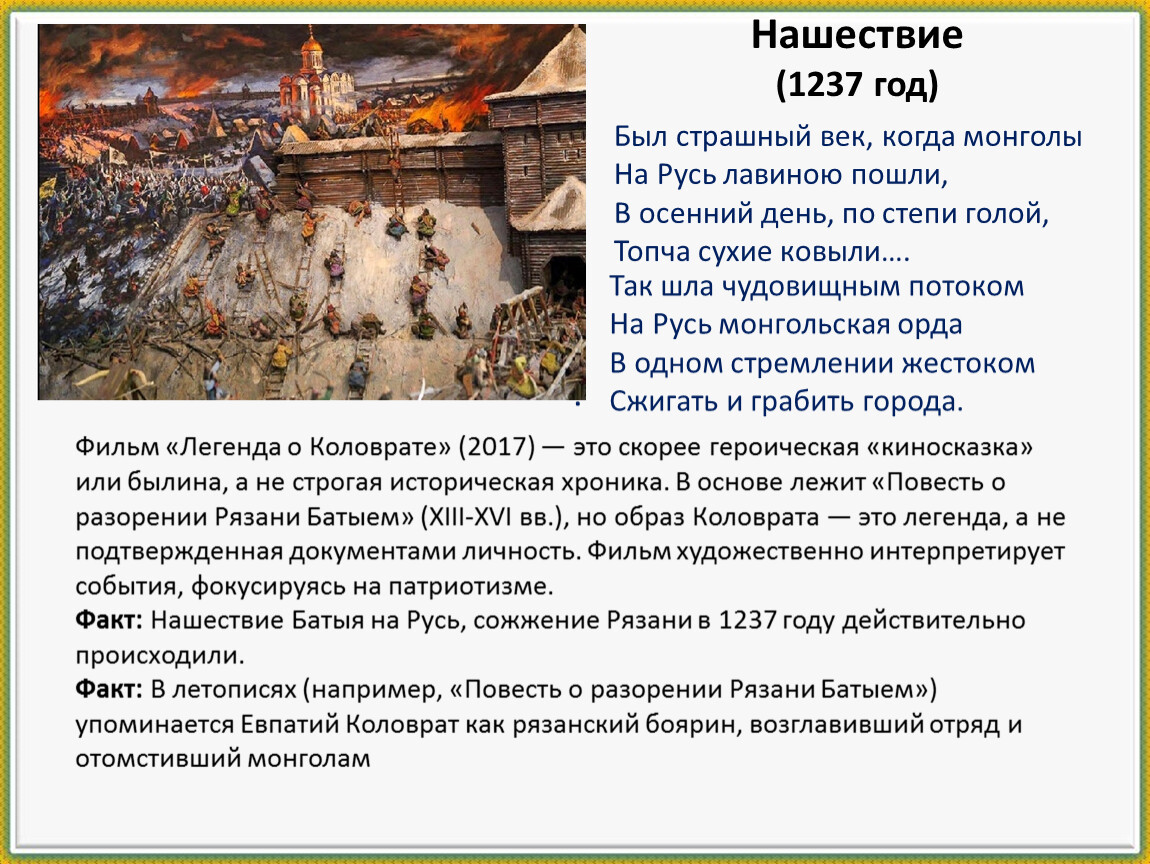 Факт: В летописях (например, «Повесть о разорении Рязани Батыем») упоминается Евпатий Коловрат как рязанский боярин, возглавивший отряд и отомстивший монголам
