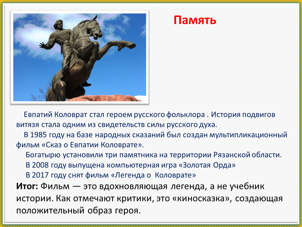 Евпатий Коловрат стал героем русского фольклора . История подвигов витязя стала одним из свидетельств силы русского духа.