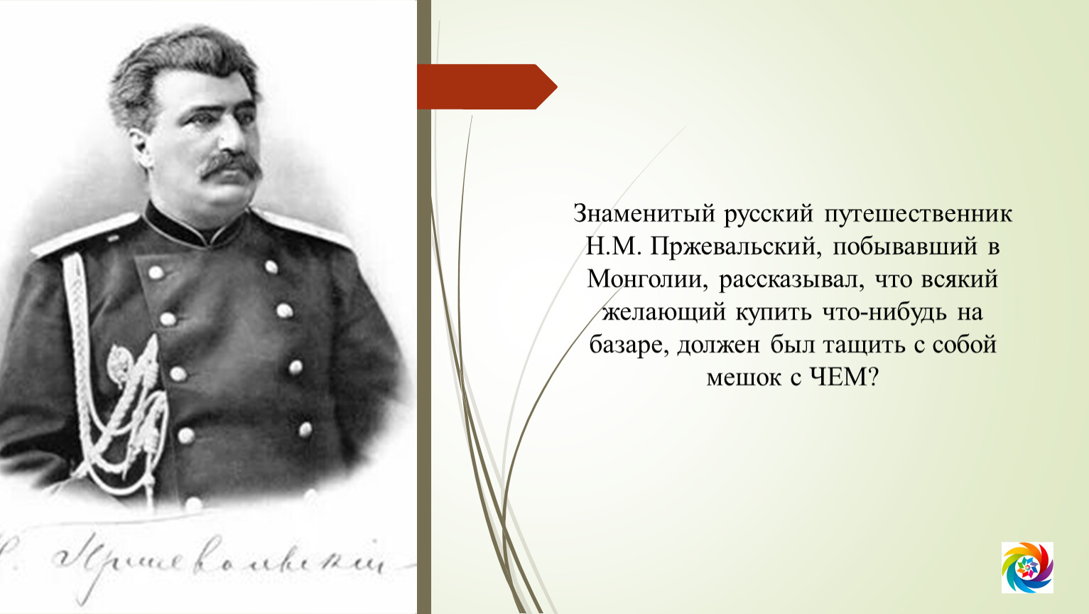 Знаменитый русский путешественник Н.М. Пржевальский, побывавший в Монголии, рассказывал, что всякий желающий купить что-нибудь на базаре, должен был тащить с собой мешок с ЧЕМ?