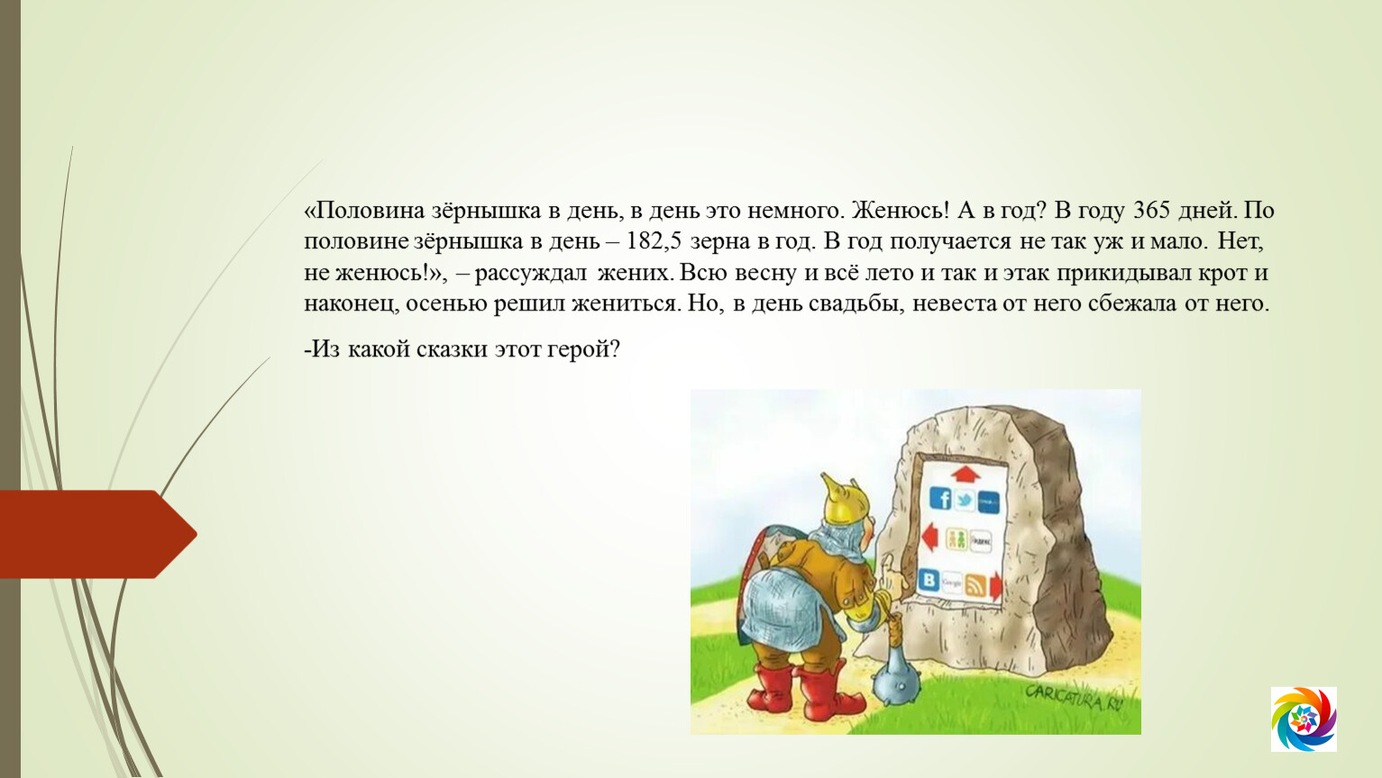«Половина зёрнышка в день, в день это немного. Женюсь! А в год? В году 365 дней. По половине зёрнышка в день – 182,5 зерна в год. В год получается не так уж и мало. Нет, не женюсь!», – рассуждал жених. Всю весну и всё лето и так и этак прикидывал крот и наконец, осенью решил жениться. Но, в день свадьбы, невеста от него сбежала от него.