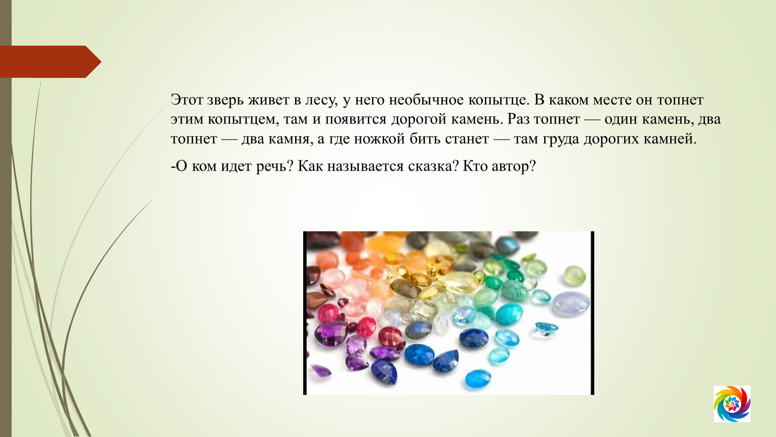 Этот зверь живет в лесу, у него необычное копытце. В каком месте он топнет этим копытцем, там и появится дорогой камень. Раз топнет — один камень, два топнет — два камня, а где ножкой бить станет — там груда дорогих камней.