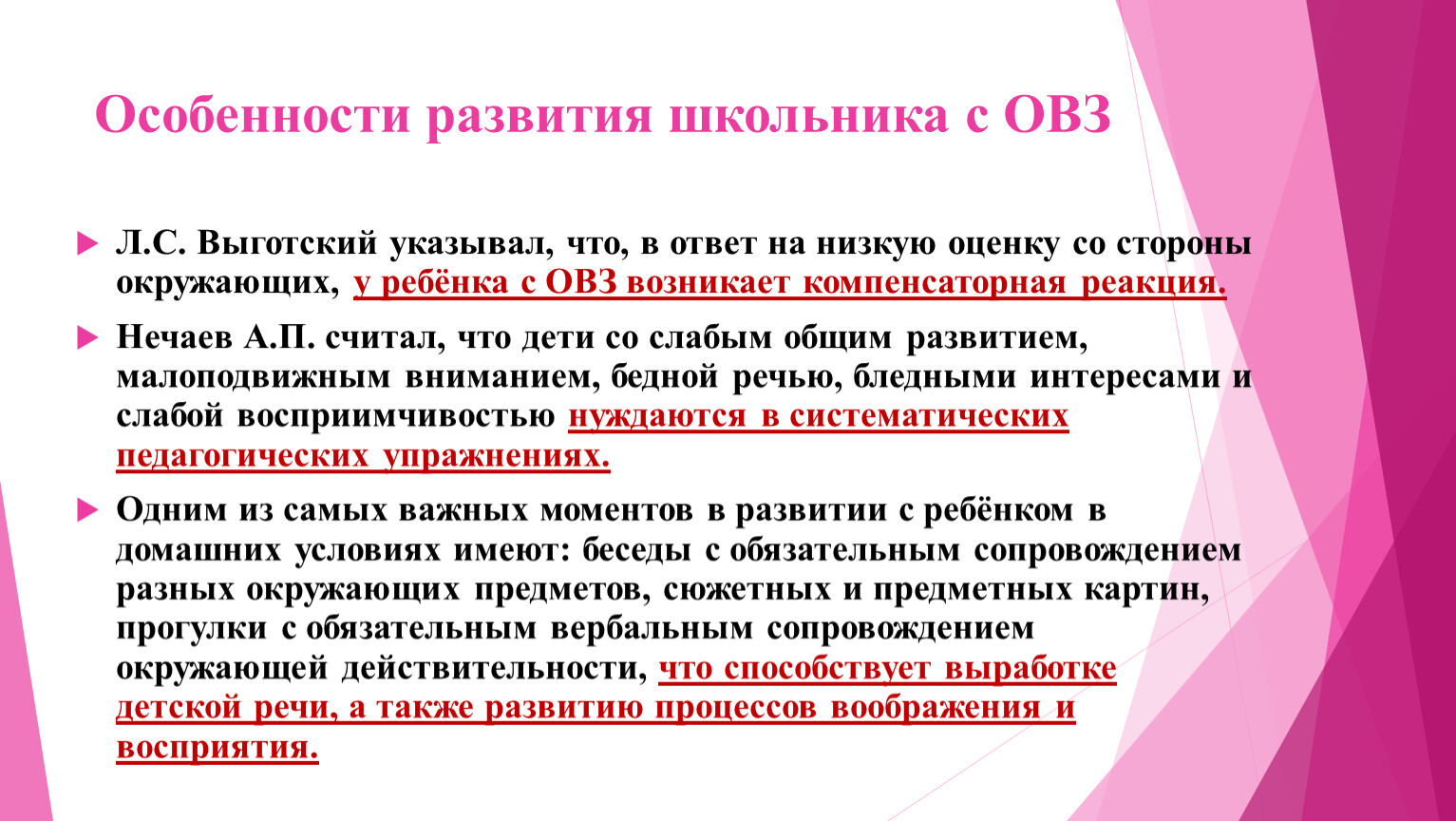 Л.С. Выготский указывал, что, в ответ на низкую оценку со стороны окружающих, у ребёнка с ОВЗ возникает компенсаторная реакция.
