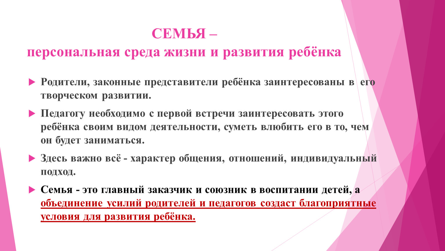 Семья - это главный заказчик и союзник в воспитании детей, а объединение усилий родителей и педагогов создаст благоприятные условия для развития ребёнка.