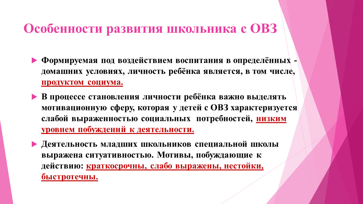 В процессе становления личности ребёнка важно выделять мотивационную сферу, которая у детей с ОВЗ характеризуется слабой выраженностью социальных потребностей, низким уровнем побуждений к деятельности.