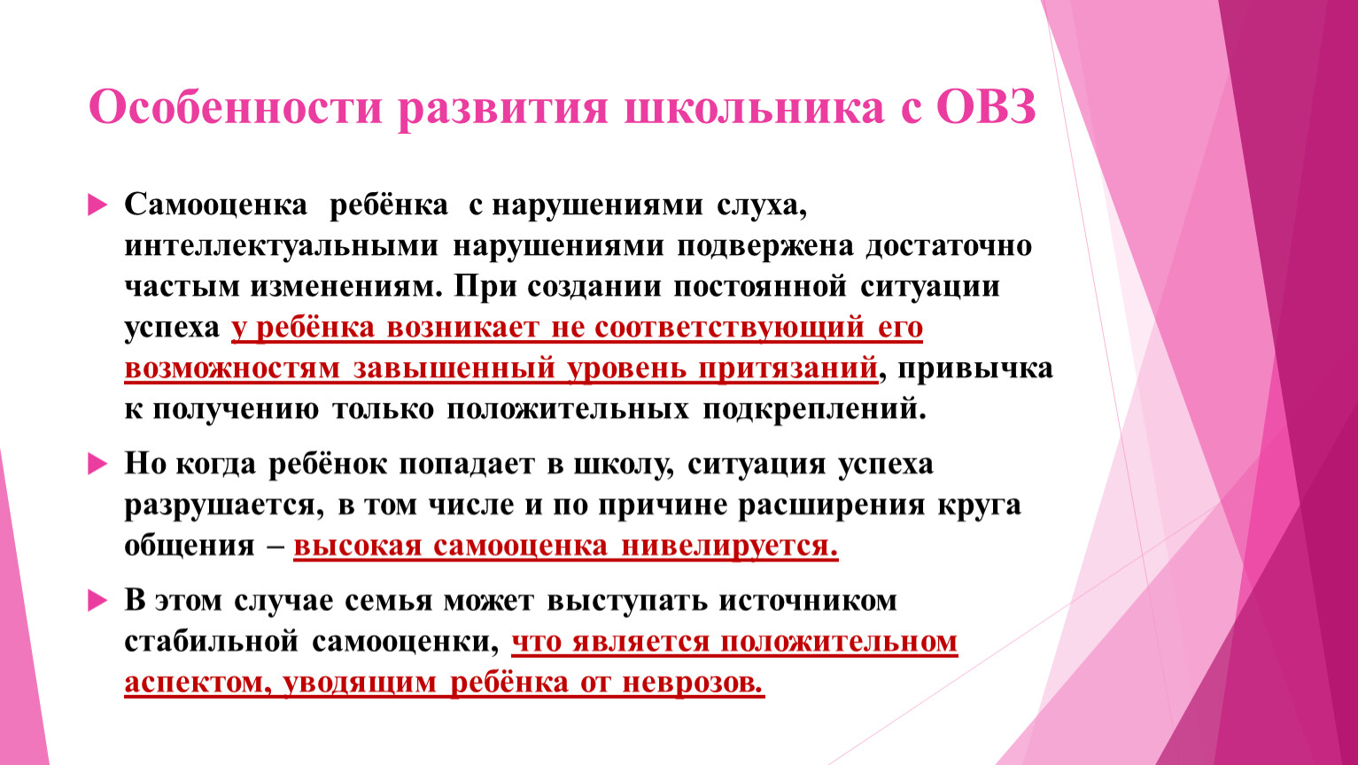 Самооценка ребёнка с нарушениями слуха, интеллектуальными нарушениями подвержена достаточно частым изменениям. При создании постоянной ситуации успеха у ребёнка возникает не соответствующий его возможностям завышенный уровень притязаний, привычка к получению только положительных подкреплений.