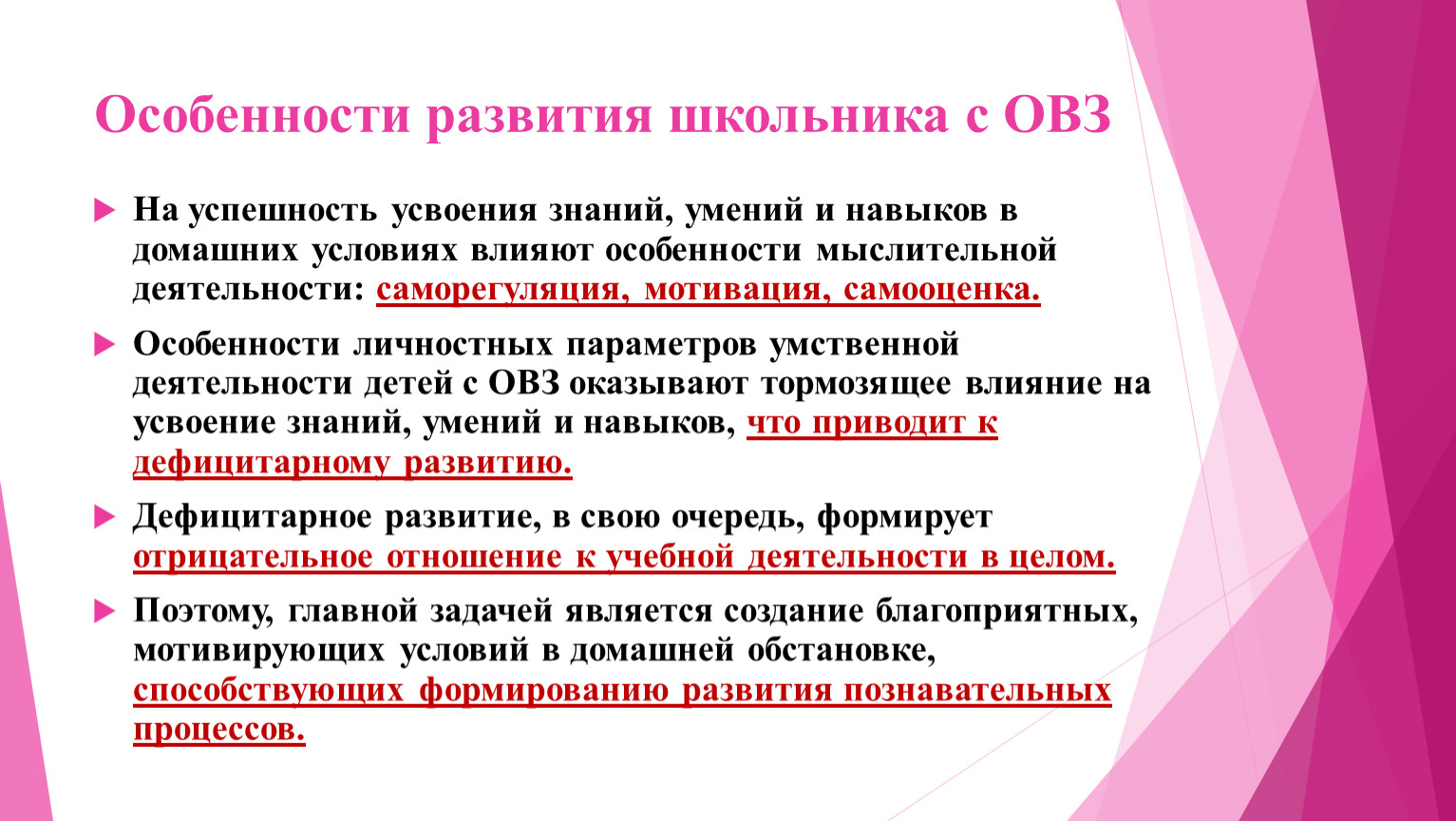Особенности личностных параметров умственной деятельности детей с ОВЗ оказывают тормозящее влияние на усвоение знаний, умений и навыков, что приводит к дефицитарному развитию.