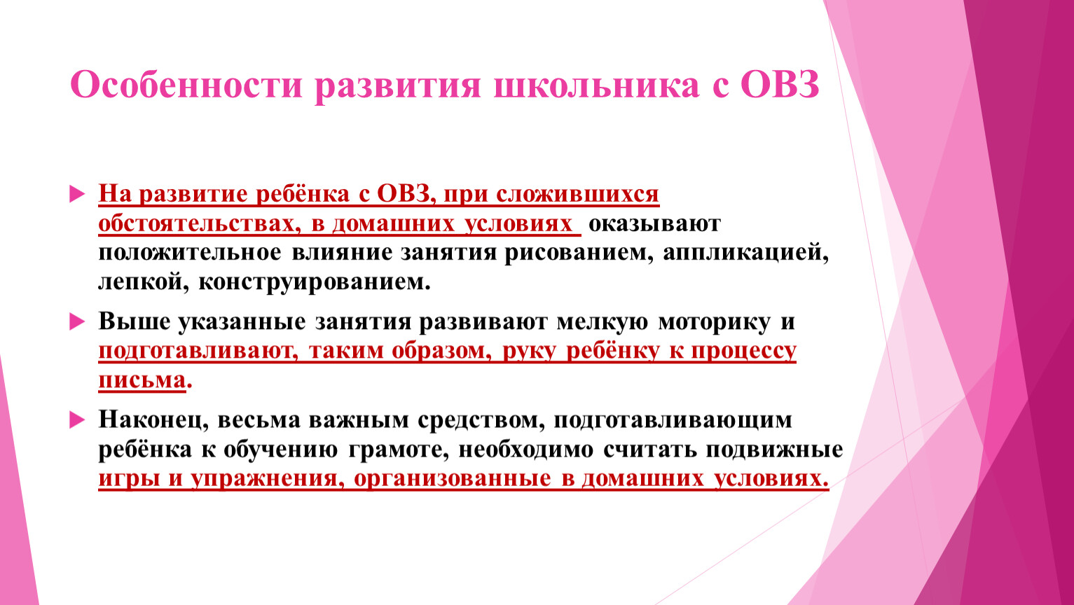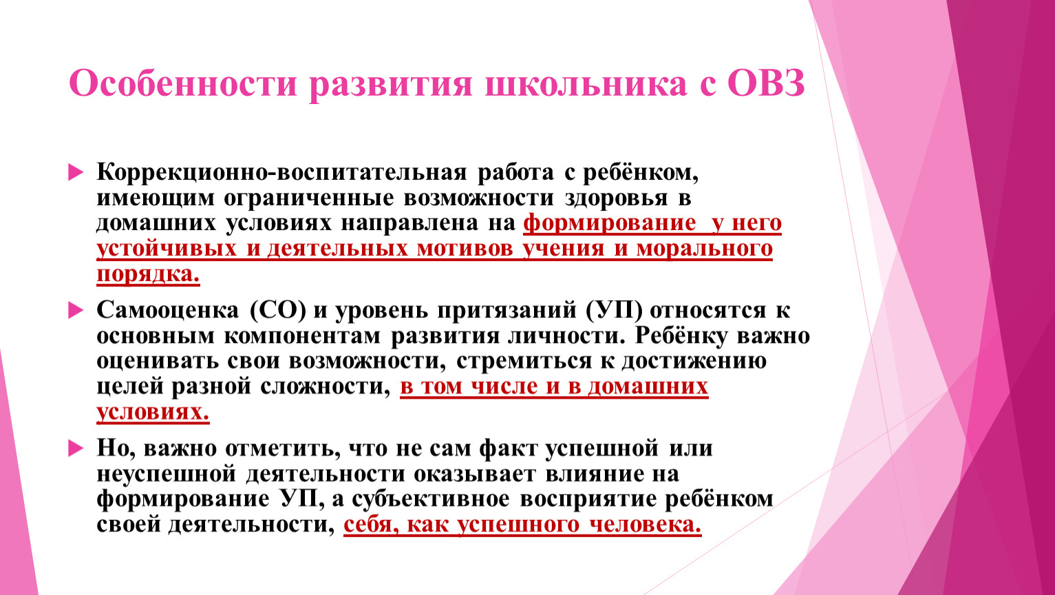 Коррекционно-воспитательная работа с ребёнком, имеющим ограниченные возможности здоровья в домашних условиях направлена на формирование у него устойчивых и деятельных мотивов учения и морального порядка.