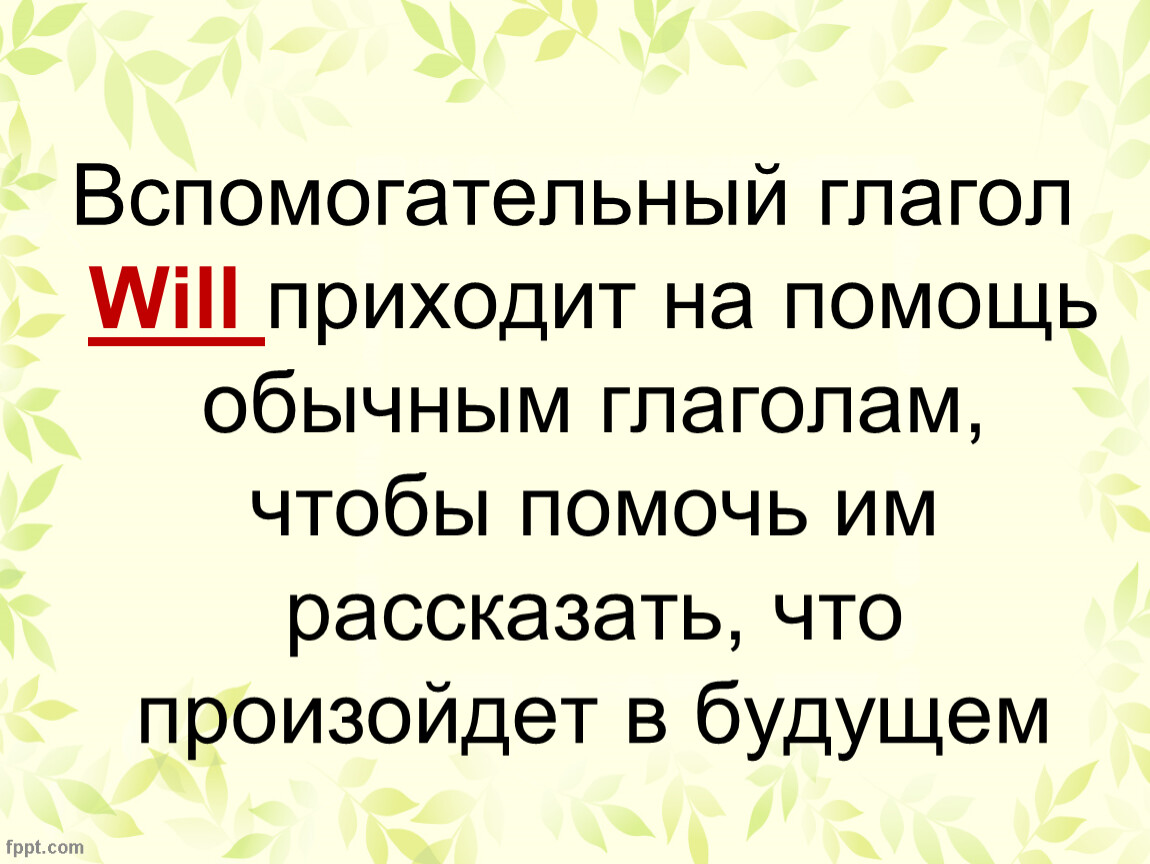 Вспомогательный глагол Will приходит на помощь обычным глаголам, чтобы помочь им рассказать, что произойдет в будущем