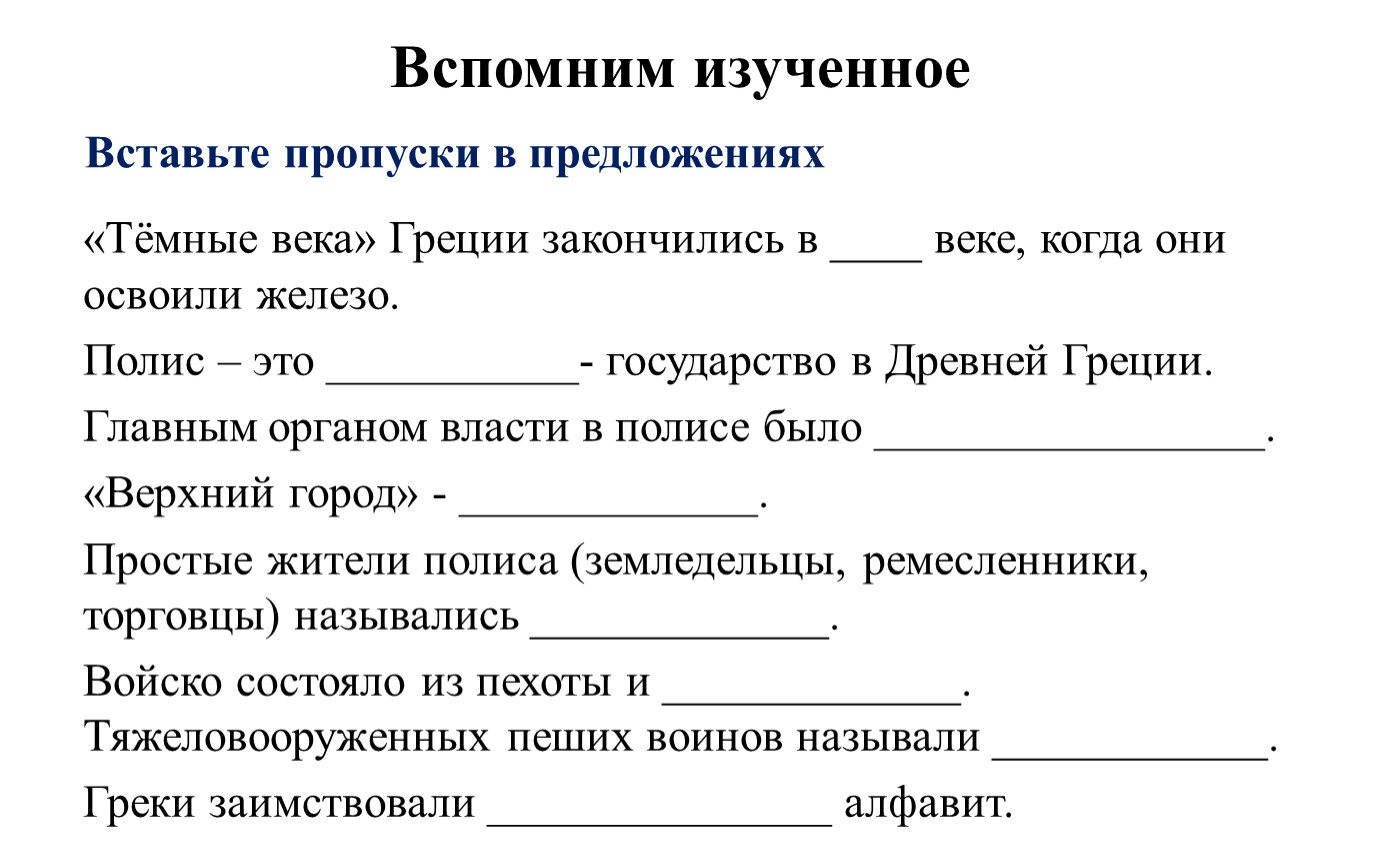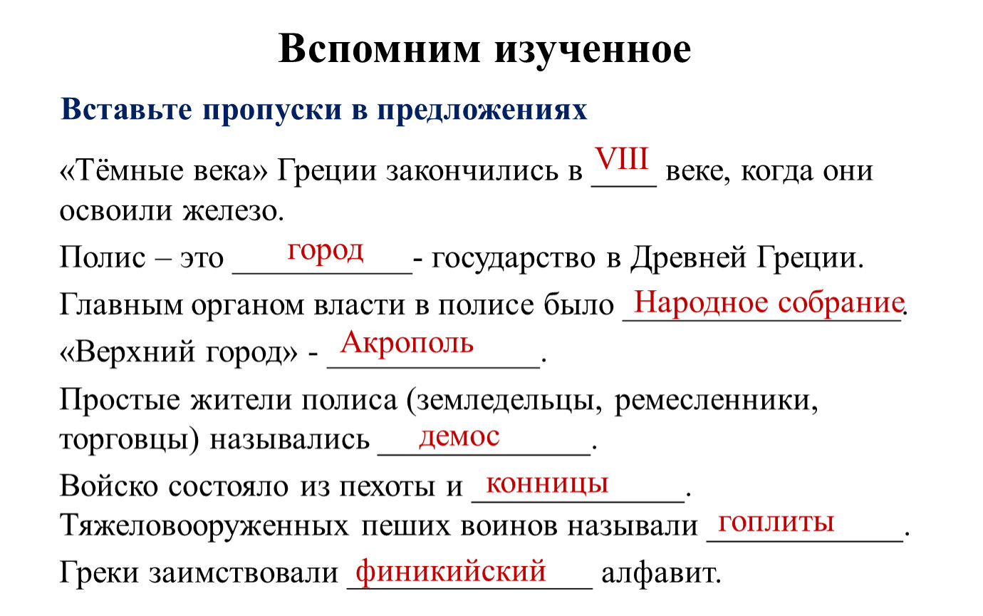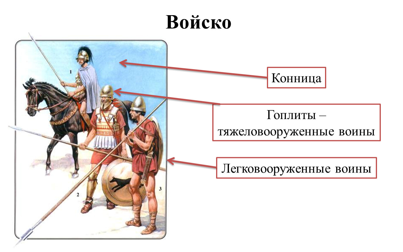 Войско состояло из пехоты и _____________. Тяжеловооруженных пеших воинов называли ____________.