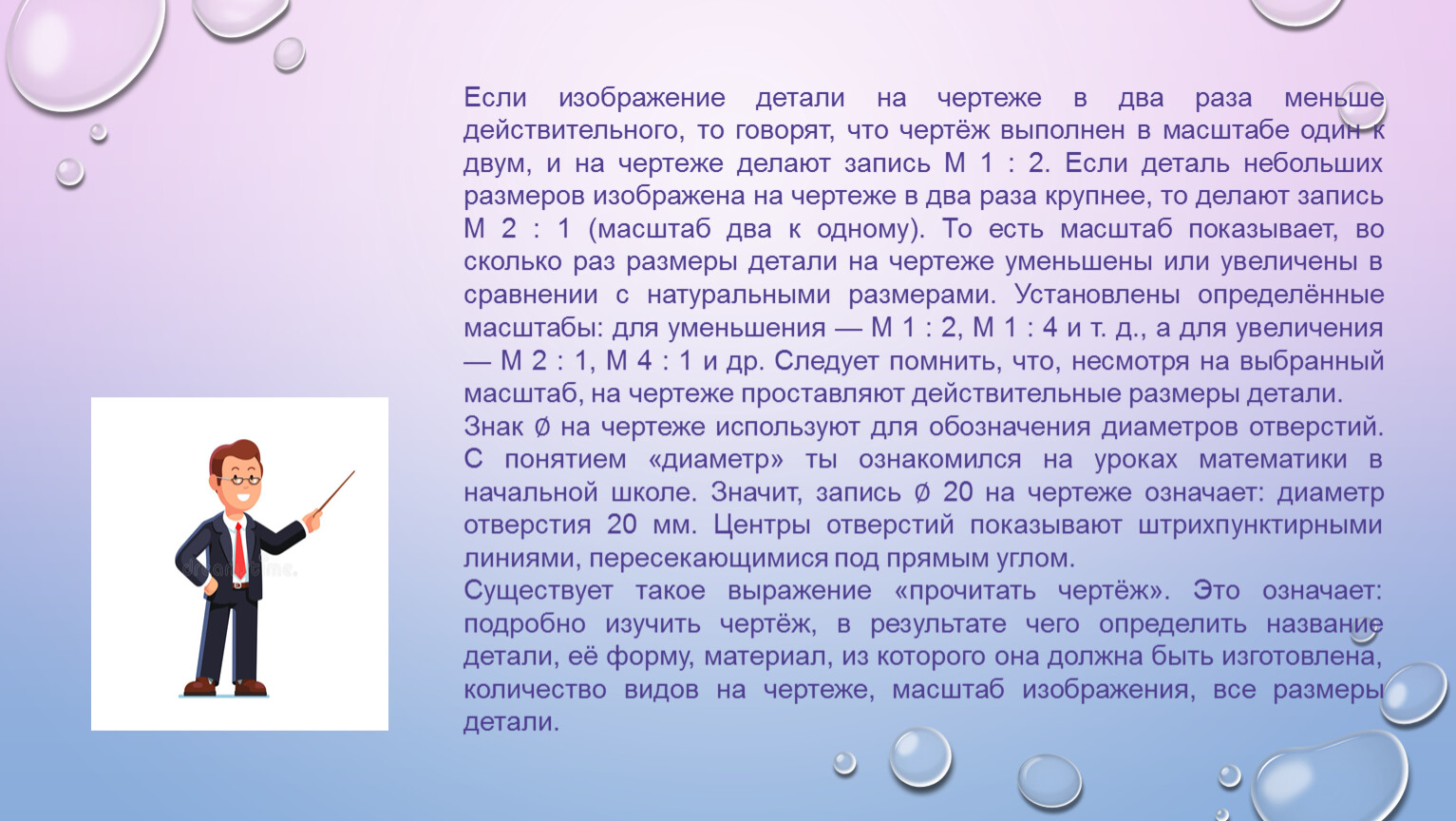 Если изображение детали на чертеже в два раза меньше действительного, то говорят, что чертёж выполнен в масштабе один к двум, и на чертеже делают запись М 1 : 2. Если деталь небольших размеров изображена на чертеже в два раза крупнее, то делают запись М 2 : 1 (масштаб два к одному). То есть масштаб показывает, во сколько раз размеры детали на чертеже уменьшены или увеличены в сравнении с натуральными размерами. Установлены определённые масштабы: для уменьшения — М 1 : 2, М 1 : 4 и т. д., а для увеличения — М 2 : 1, М 4 : 1 и др. Следует помнить, что, несмотря на выбранный масштаб, на чертеже проставляют действительные размеры детали.