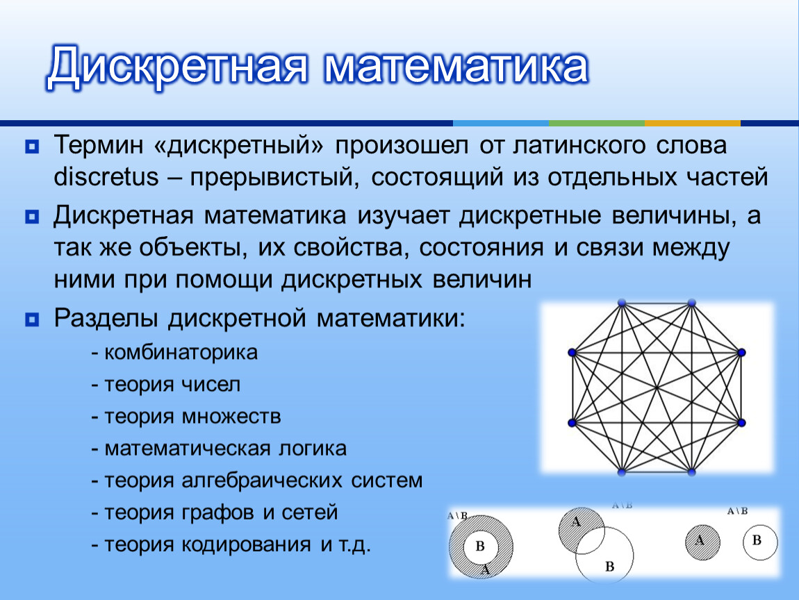 Дискретная математика изучает дискретные величины, а так же объекты, их свойства, состояния и связи между ними при помощи дискретных величин