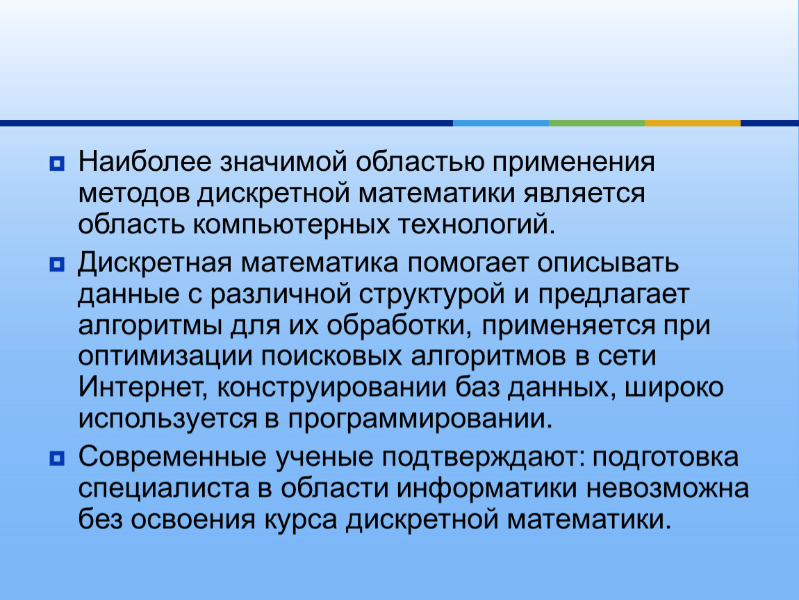 Современные ученые подтверждают: подготовка специалиста в области информатики невозможна без освоения курса дискретной математики.