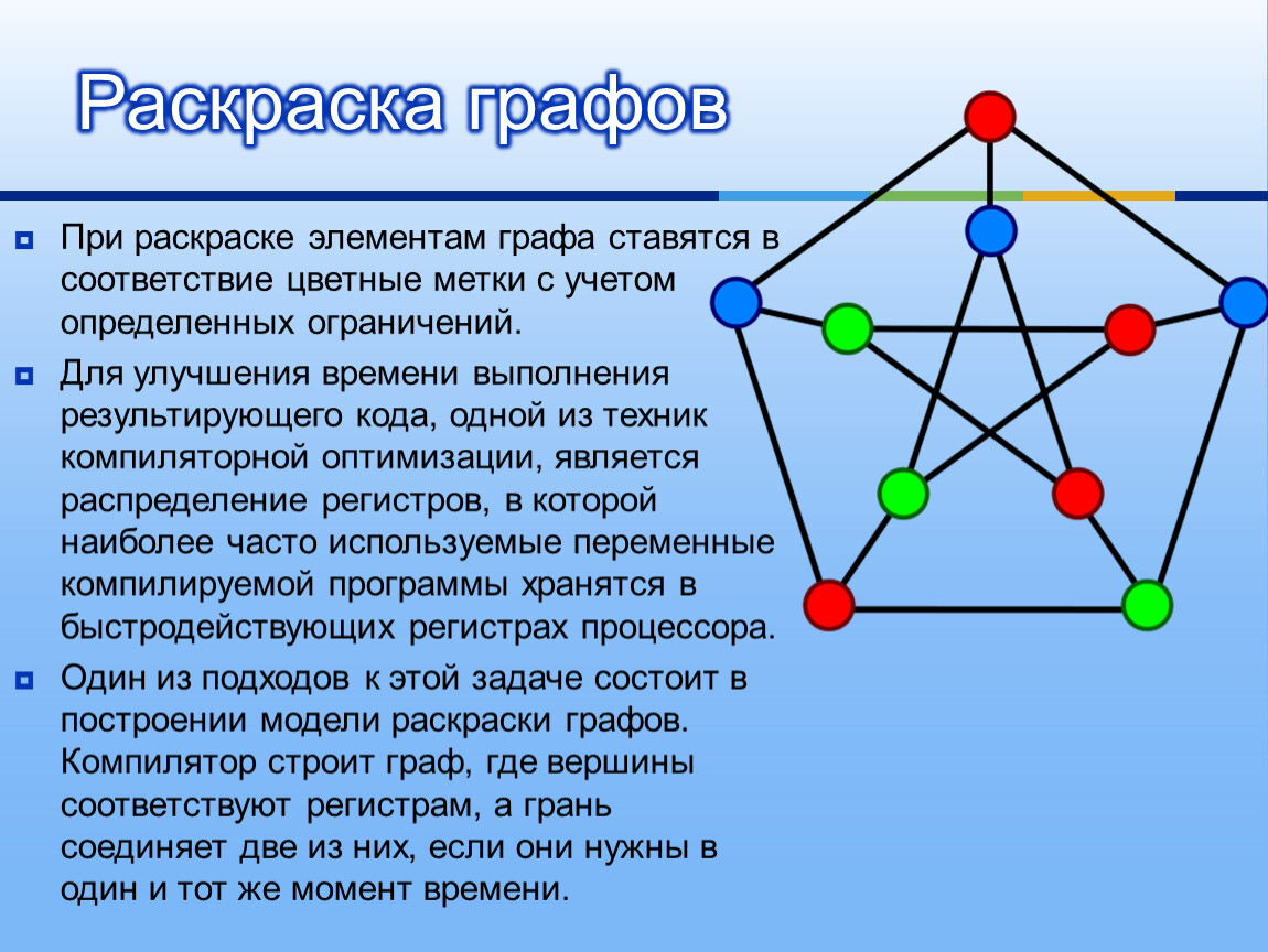 При раскраске элементам графа ставятся в соответствие цветные метки с учетом определенных ограничений.
