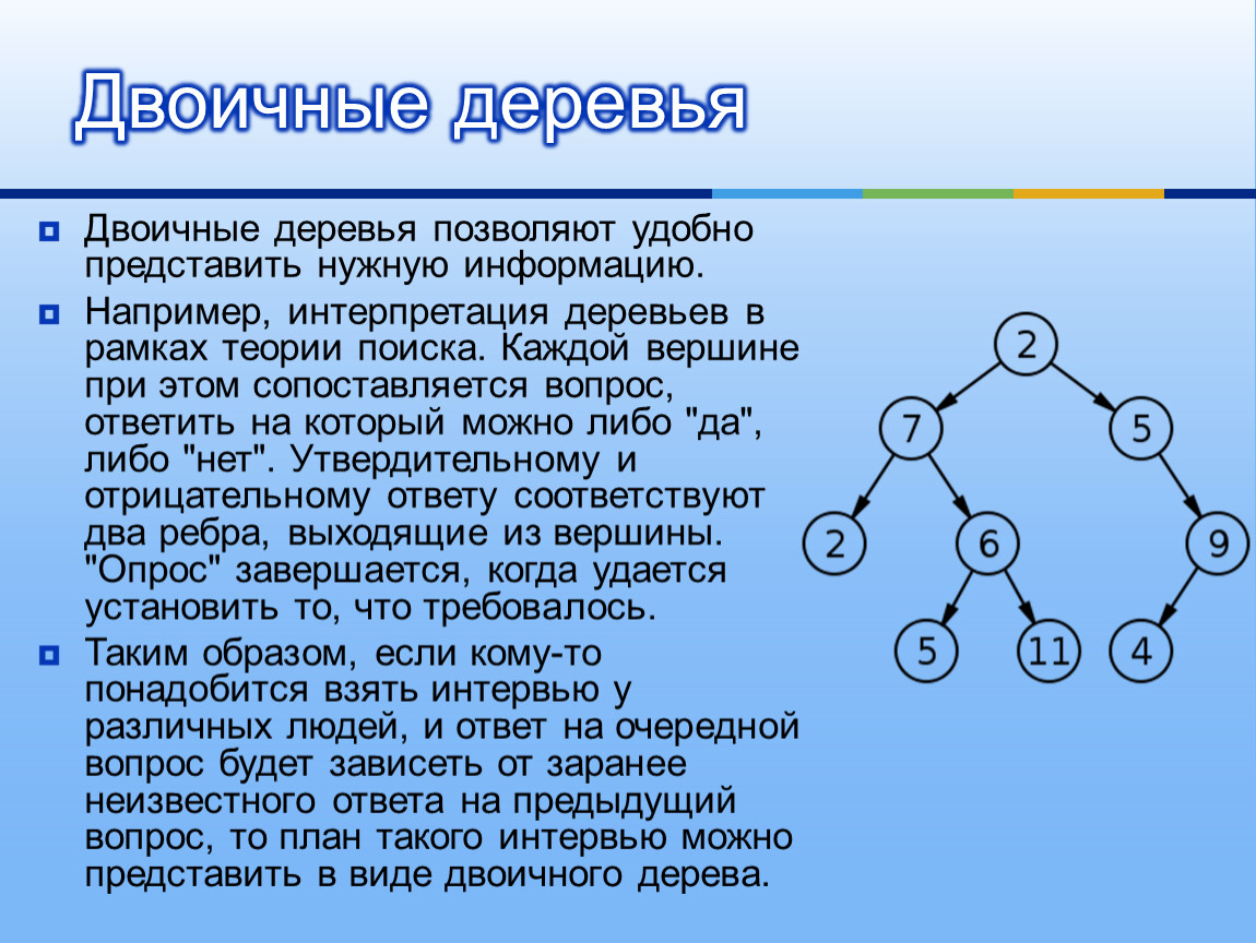 Таким образом, если кому-то понадобится взять интервью у различных людей, и ответ на очередной вопрос будет зависеть от заранее неизвестного ответа на предыдущий вопрос, то план такого интервью можно представить в виде двоичного дерева.