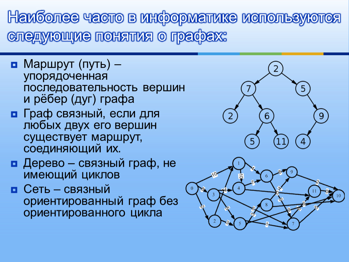 Наиболее часто в информатике используются следующие понятия о графах: