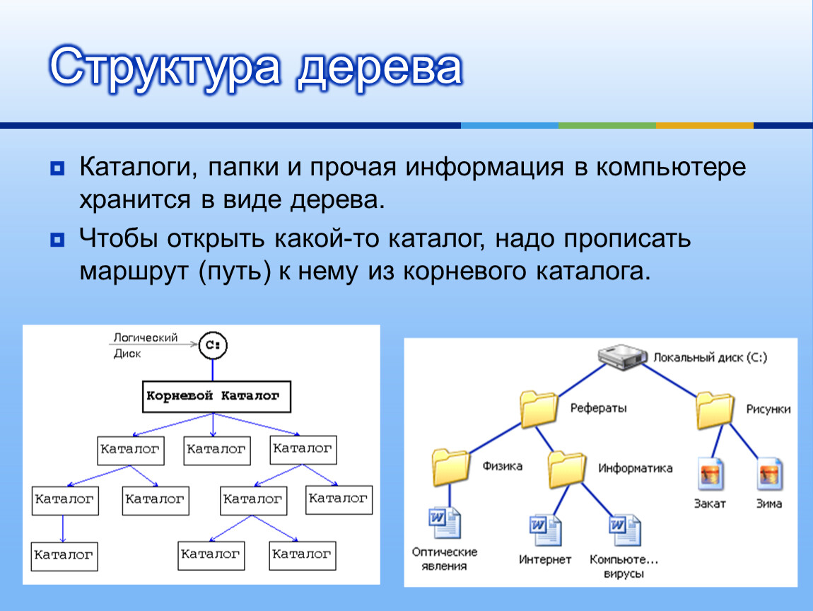 Каталоги, папки и прочая информация в компьютере хранится в виде дерева.