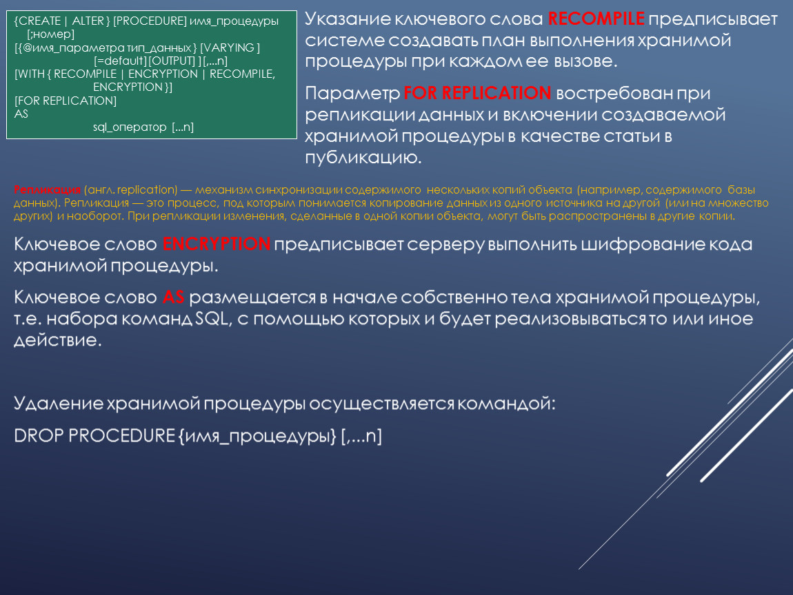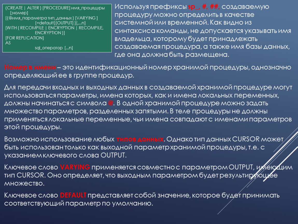 Используя префиксы sp_, #, ##, создаваемую процедуру можно определить в качестве системной или временной. Как видно из синтаксиса команды, не допускается указывать имя владельца, которому будет принадлежать создаваемая процедура, а также имя базы данных, где она должна быть размещена.