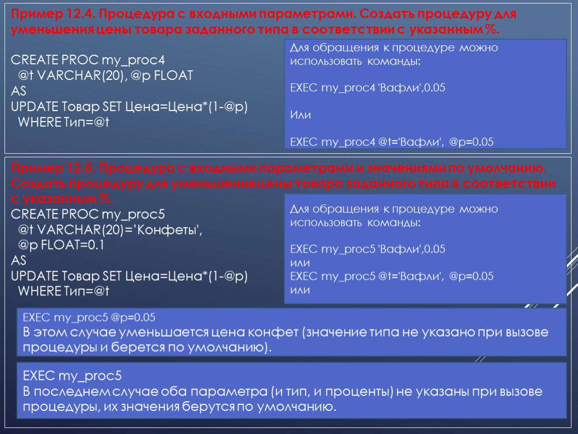 Пример 12.5. Процедура с входными параметрами и значениями по умолчанию. Создать процедуру для уменьшения цены товара заданного типа в соответствии с указанным %.
