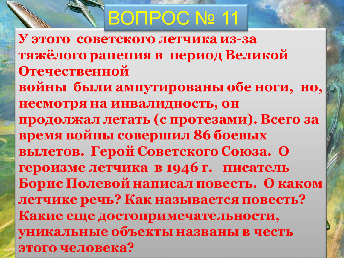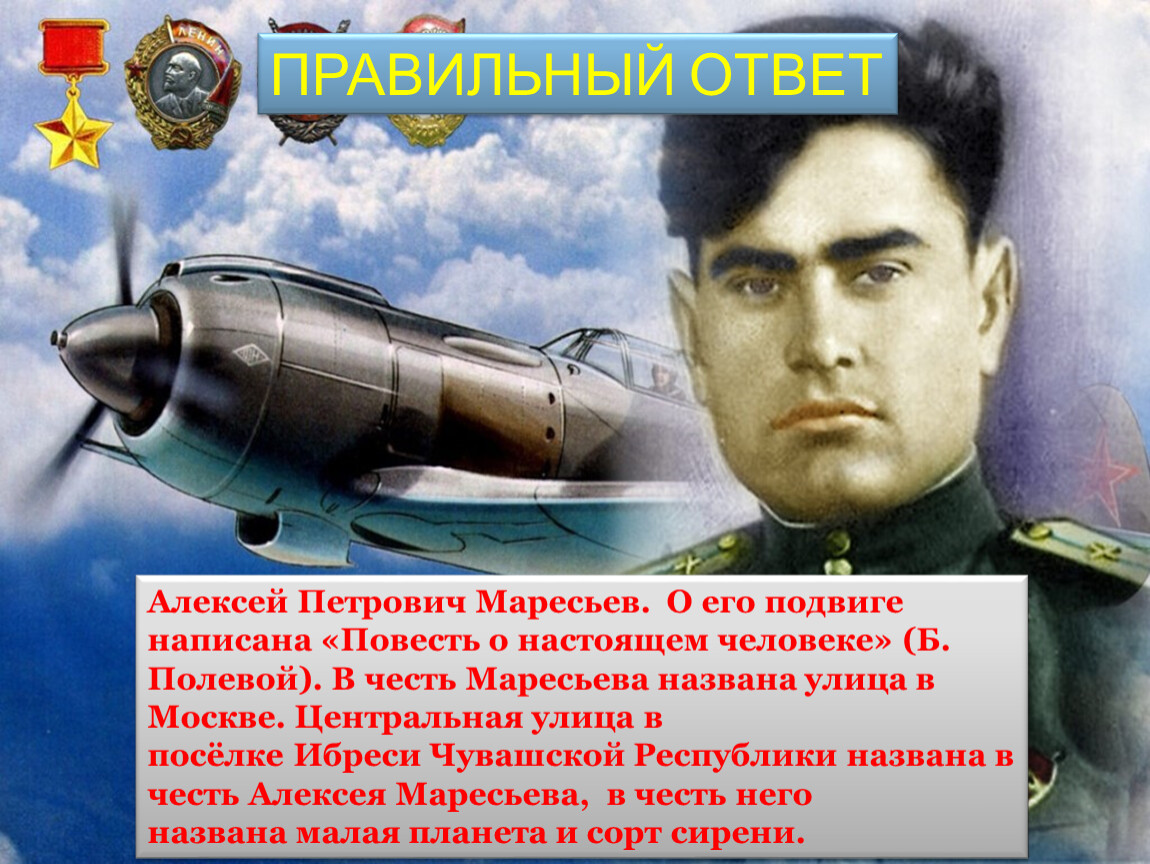 У этого советского летчика из-за тяжёлого ранения в период Великой Отечественной войны были ампутированы обе ноги, но, несмотря на инвалидность, он продолжал летать (с протезами). Всего за время войны совершил 86 боевых вылетов. Герой Советского Союза. О героизме летчика в 1946 г. писатель Борис Полевой написал повесть. О каком летчике речь? Как называется повесть? Какие еще достопримечательности, уникальные объекты названы в честь этого человека?