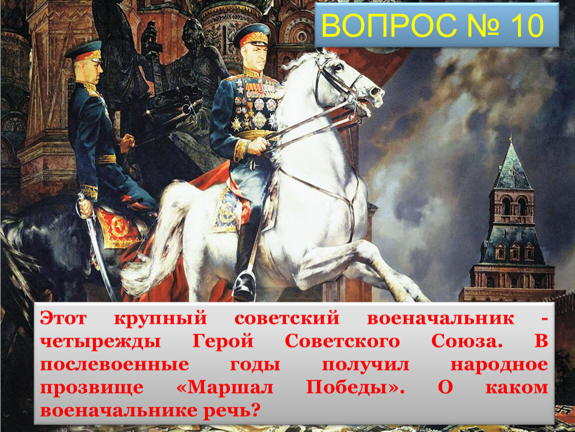 Этот крупный советский военачальник - четырежды Герой Советского Союза. В послевоенные годы получил народное прозвище «Маршал Победы». О каком военачальнике речь?
