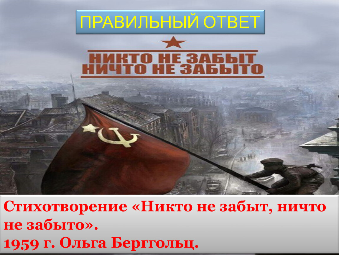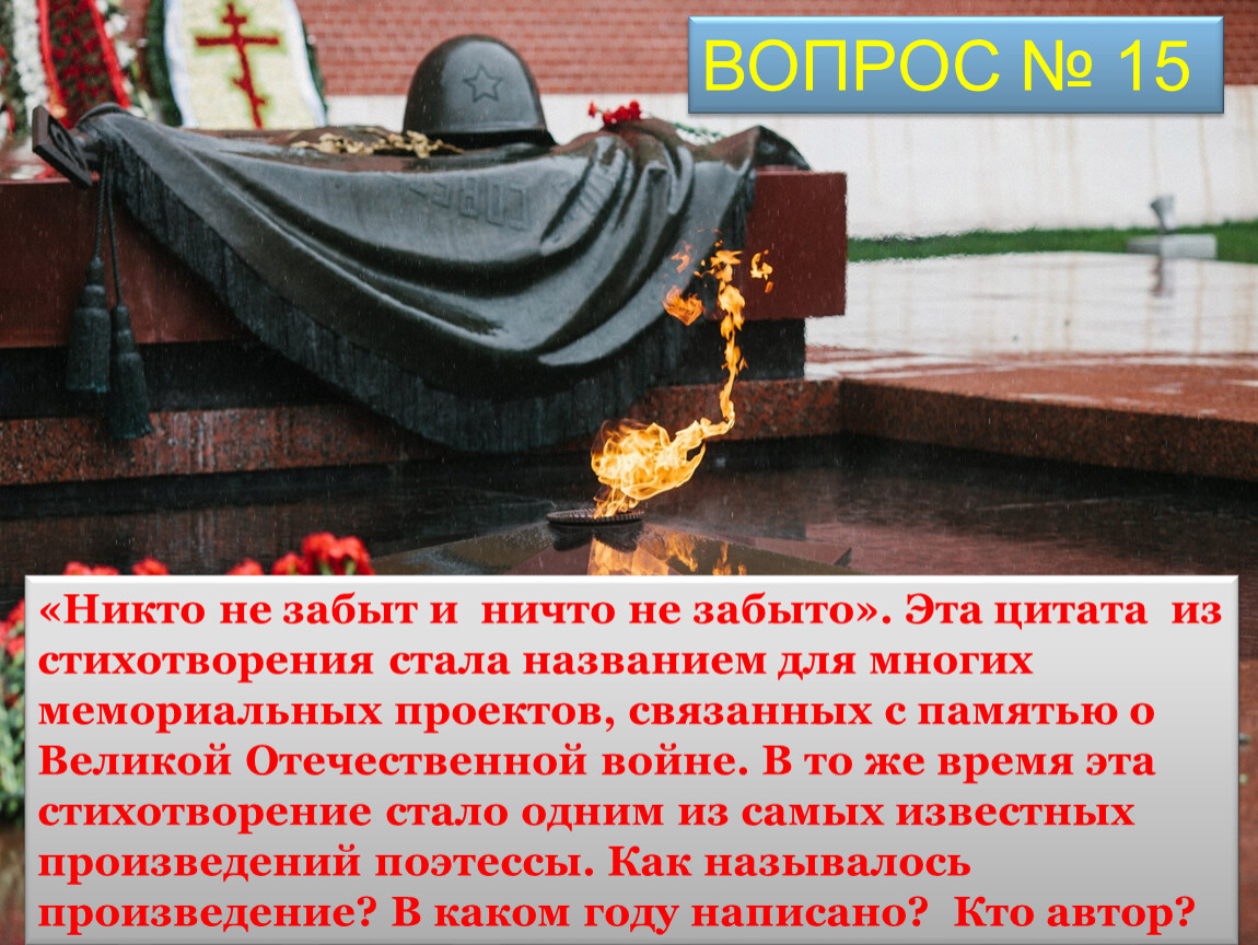 «Никто не забыт и ничто не забыто». Эта цитата из стихотворения стала названием для многих мемориальных проектов, связанных с памятью о Великой Отечественной войне. В то же время эта стихотворение стало одним из самых известных произведений поэтессы. Как называлось произведение? В каком году написано? Кто автор?