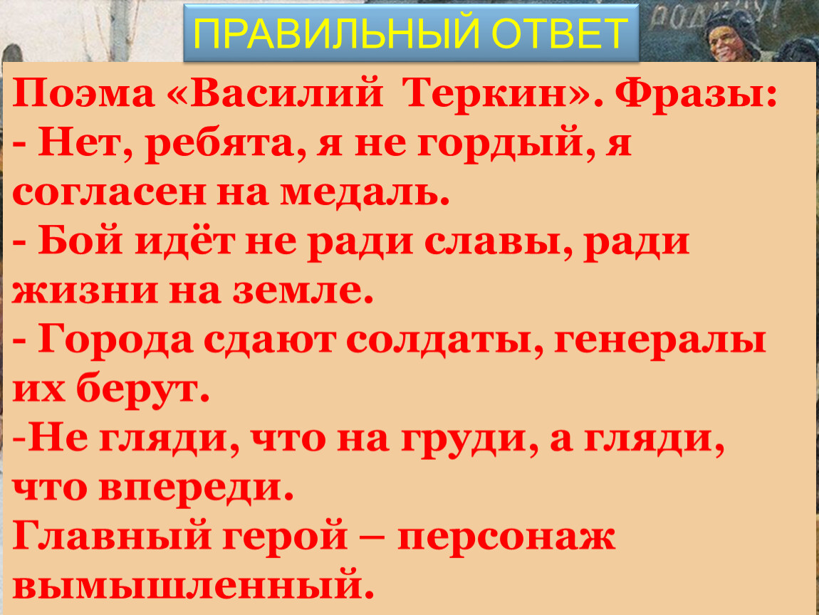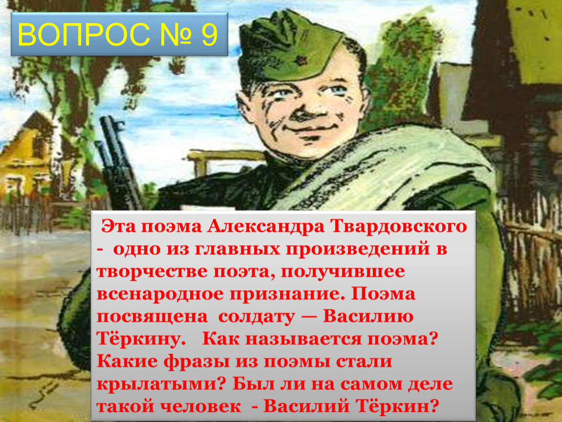 Эта поэма Александра Твардовского - одно из главных произведений в творчестве поэта, получившее всенародное признание. Поэма посвящена солдату — Василию Тёркину. Как называется поэма? Какие фразы из поэмы стали крылатыми? Был ли на самом деле такой человек - Василий Тёркин?
