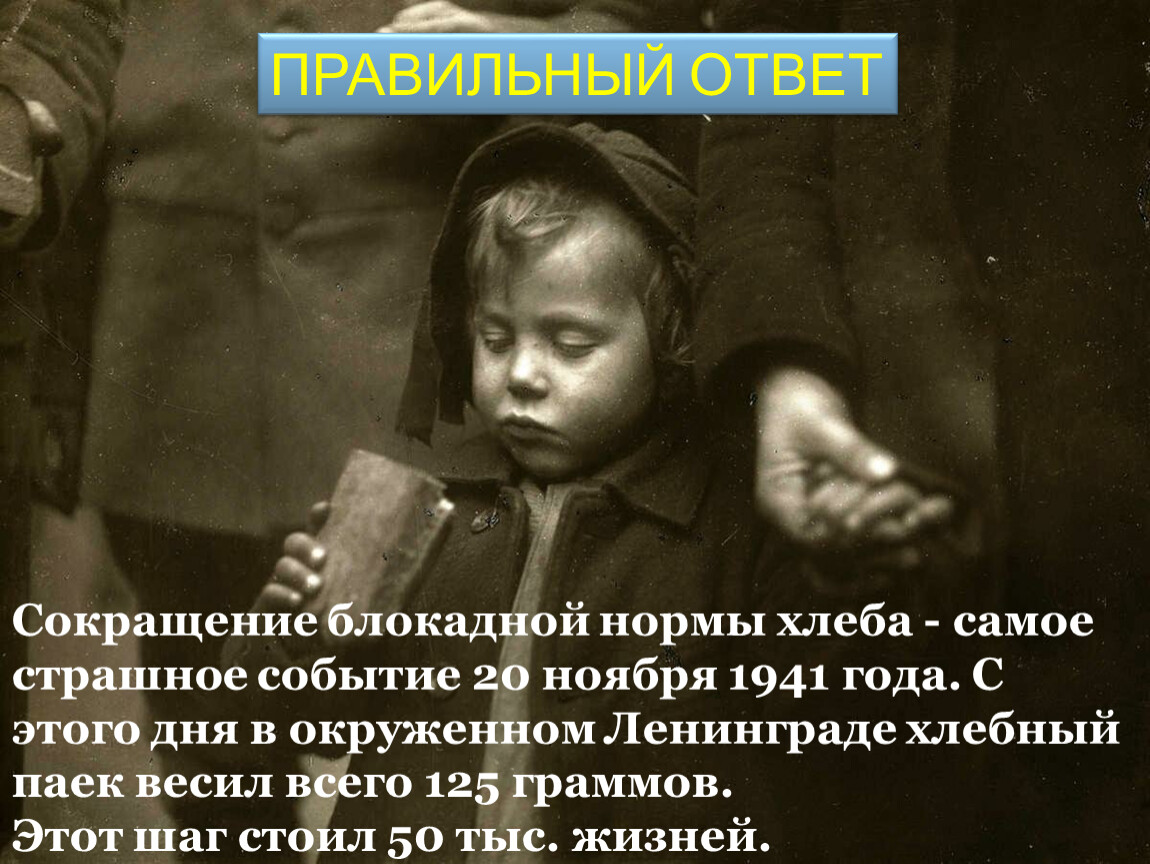 Сокращение блокадной нормы хлеба - самое страшное событие 20 ноября 1941 года. С этого дня в окруженном Ленинграде хлебный паек весил всего 125 граммов.